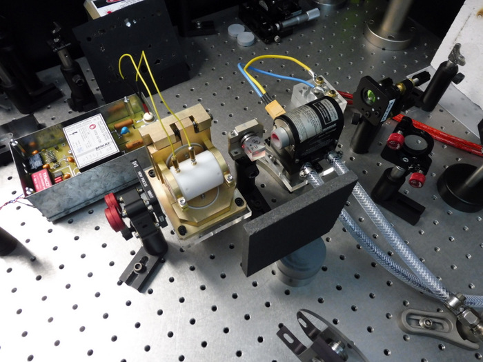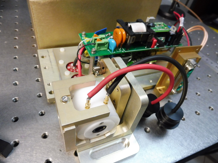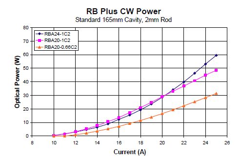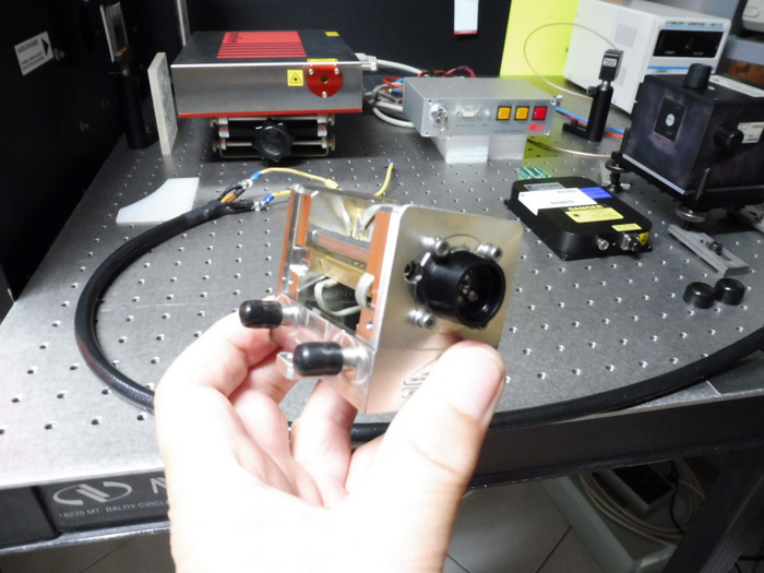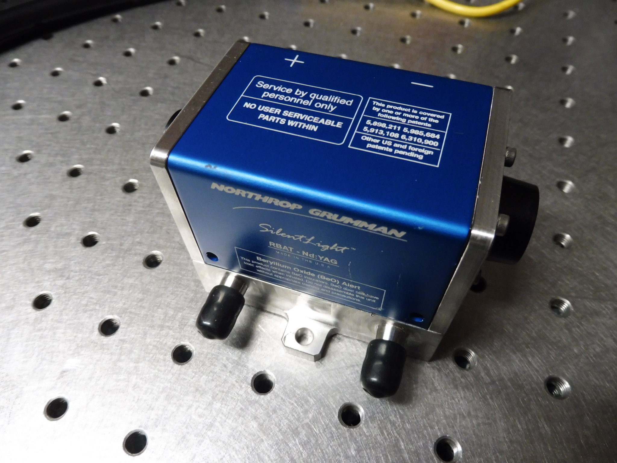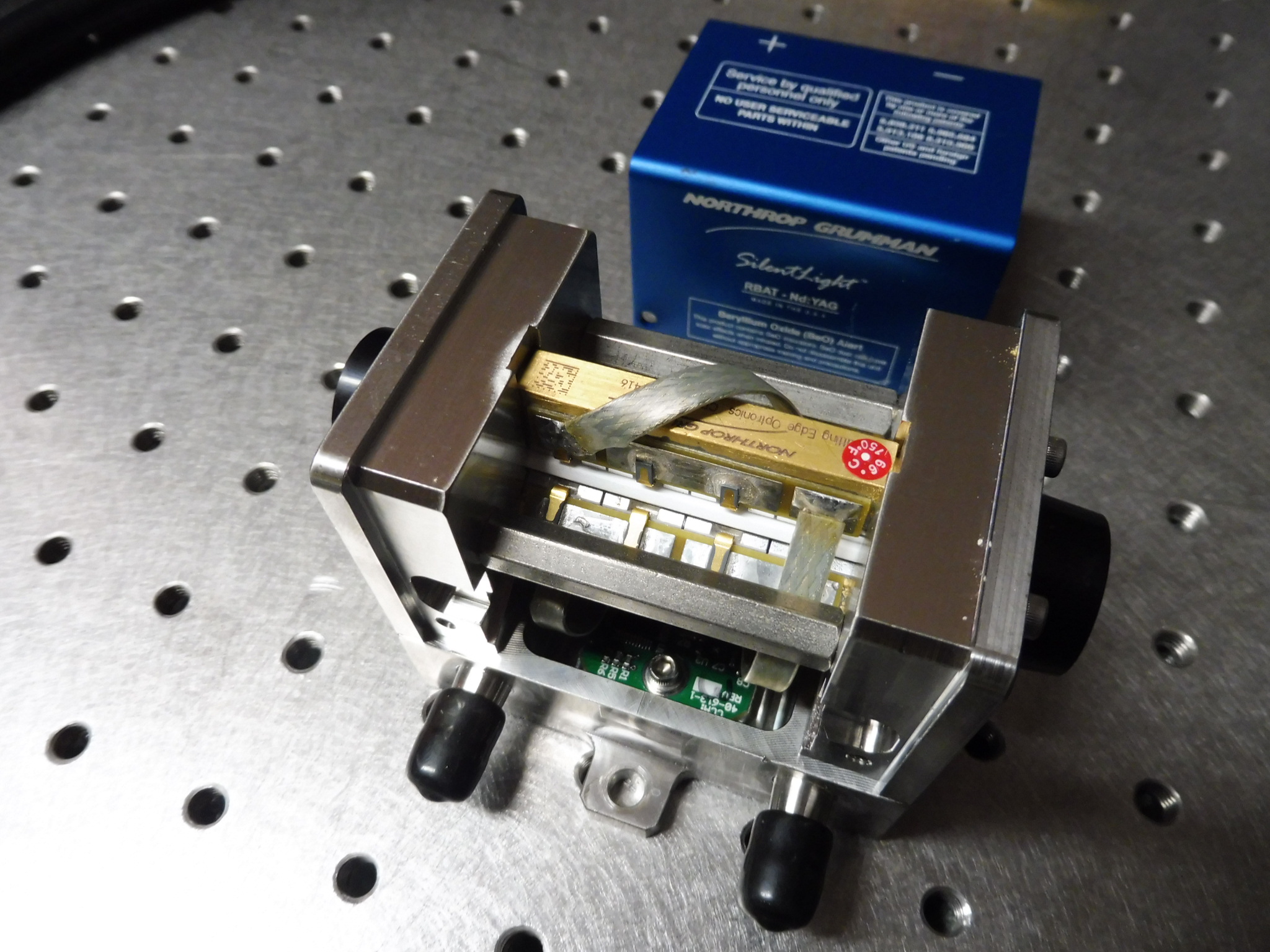 Cette tête laser se compose d'un barreau Nd:YAG de diamètre 2mm et 73mm de long dopé à 0.6% de néodyme. Les faces du barreau sont traités anti-réflection pour 808nm et sont convexes pour compenser l'effet de lentille du barreau. Le pompage se fait par 3 rangées de 3 diodes soit 9 diodes lasers de 20W chacune à 808nm. L'alimentation se fait en 18VDC et 26A max. Je vais faire fonctionner ce laser en mode continu, puis en Q-switch avec un AOM , puis en MOPA (Master Oscillator Power Amplifier) avec une 2ème tête comportant un barreau de 3mm x 65mm. Pour un premier test, je vais utiliser un miroir HR avec un rayon de courbure de -700mm et un miroir de sortie plan à 80% de réflection.