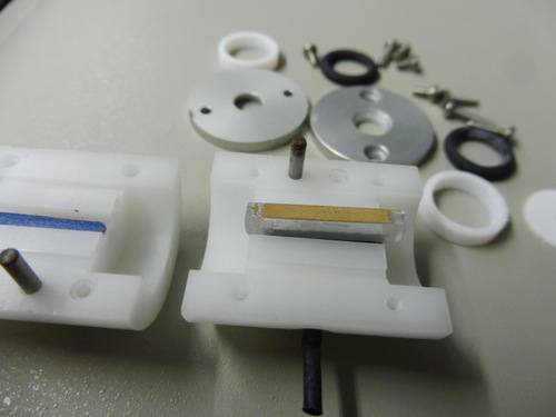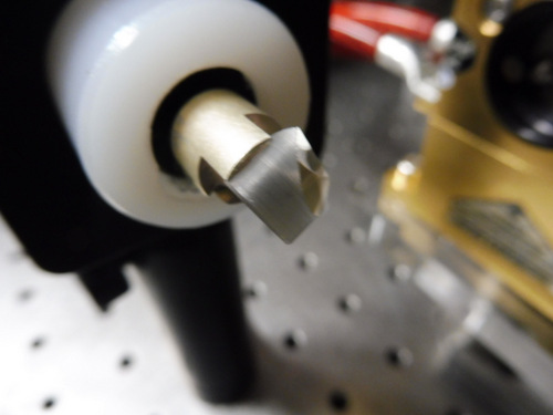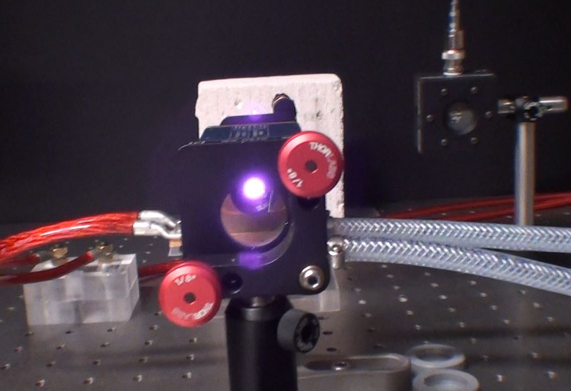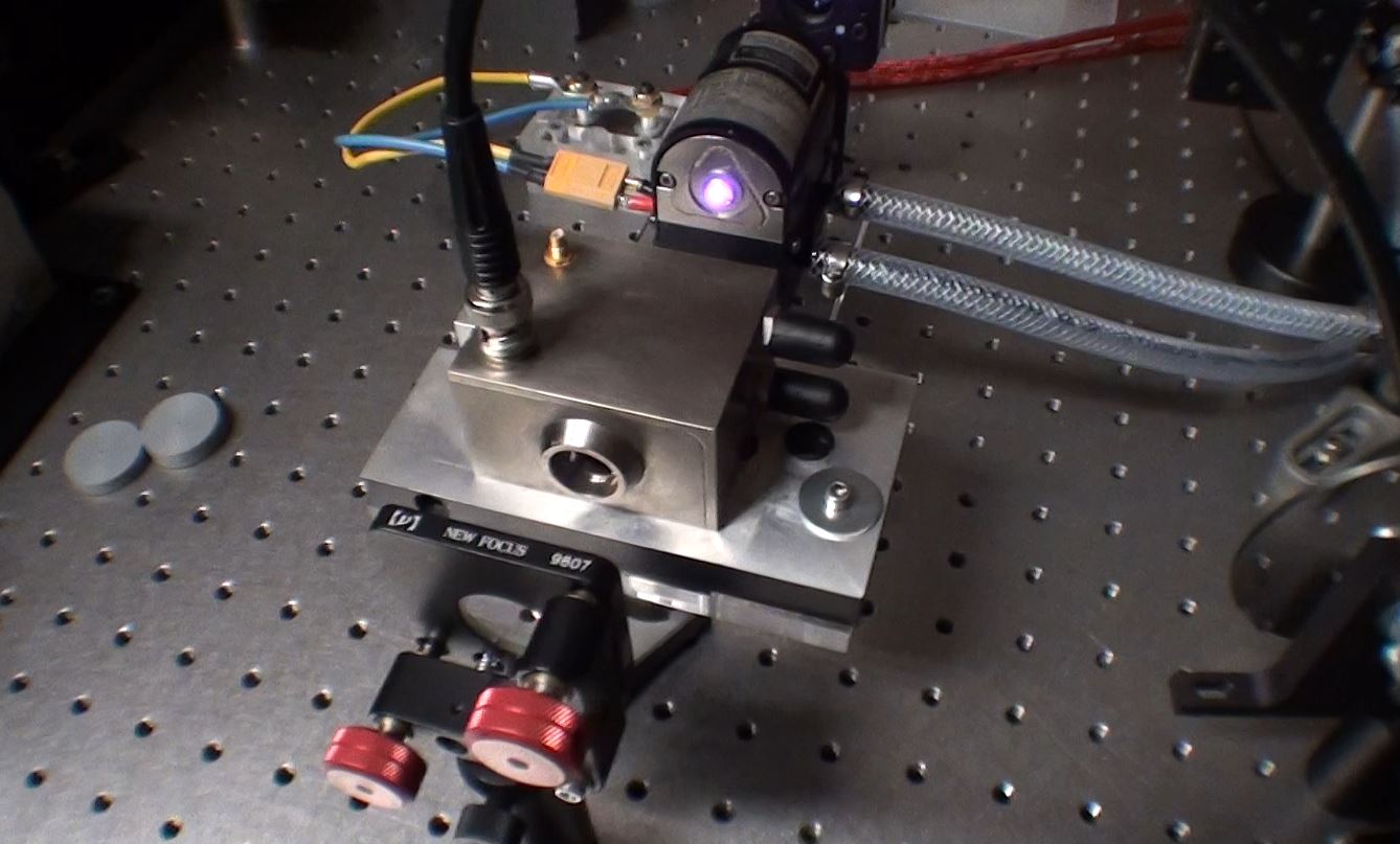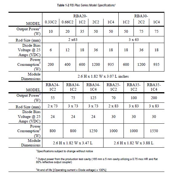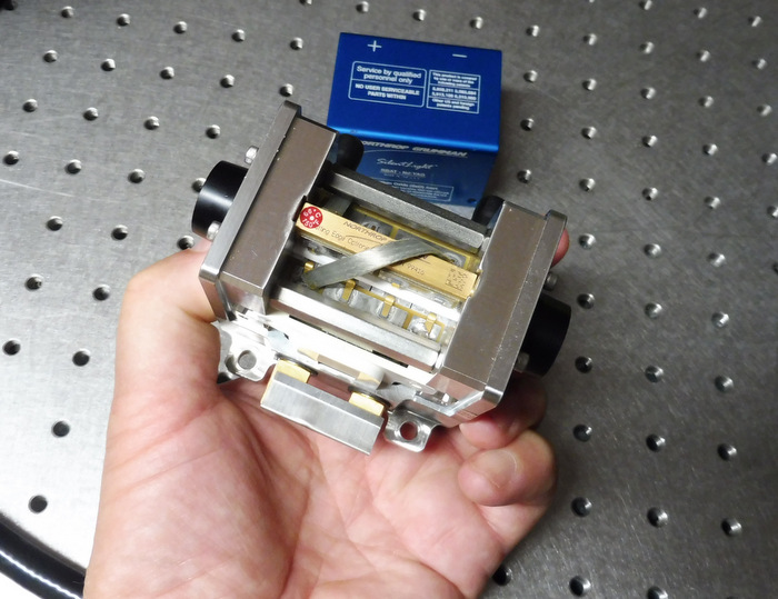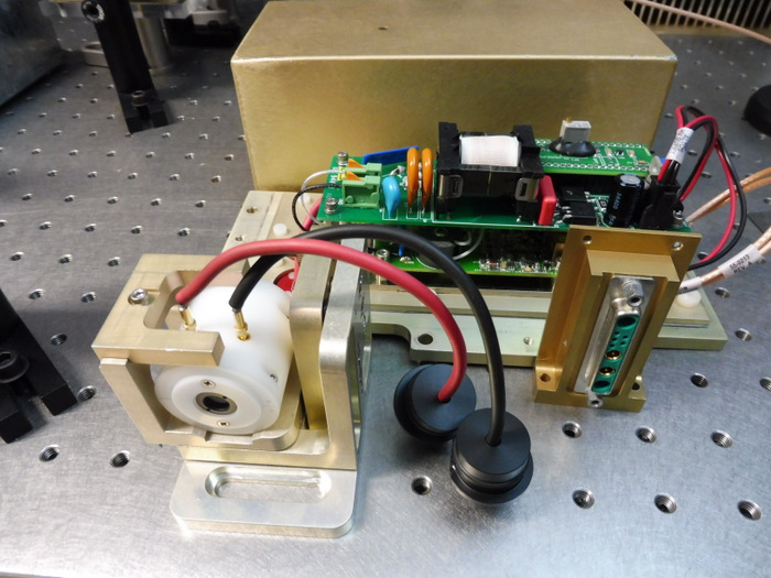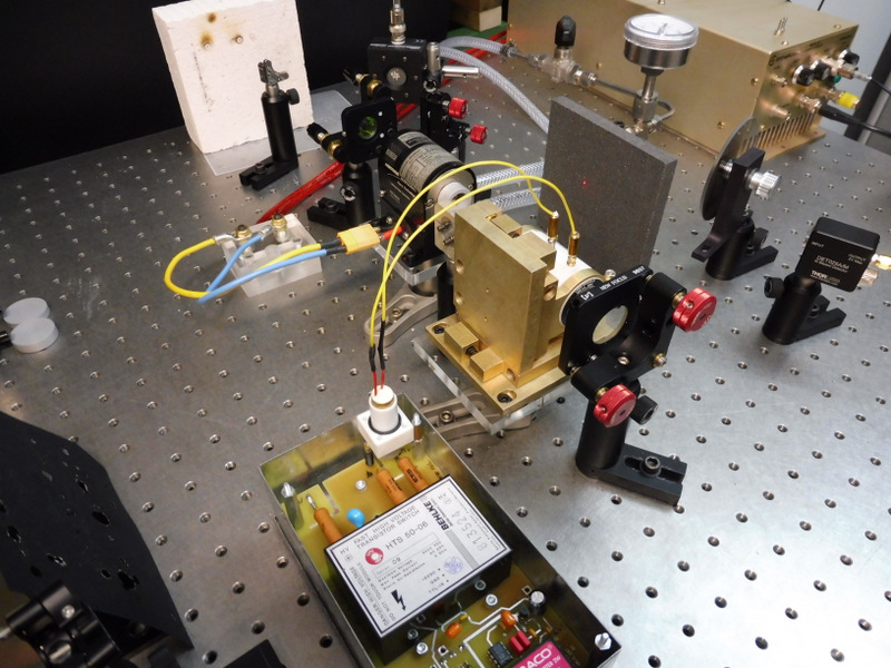 Cette tête laser se compose d'un barreau Nd:YAG de diamètre 2mm et 73mm de long dopé à 0.6% de néodyme. Les faces du barreau sont traités anti-réflection pour 808nm et sont convexes pour compenser l'effet de lentille du barreau. Le pompage se fait par 3 rangées de 3 diodes soit 9 diodes lasers de 20W chacune à 808nm. L'alimentation se fait en 18VDC et 26A max. Je vais faire fonctionner ce laser en mode continu, puis en Q-switch avec un AOM , puis en MOPA (Master Oscillator Power Amplifier) avec une 2ème tête comportant un barreau de 3mm x 65mm. Pour un premier test, je vais utiliser un miroir HR avec un rayon de courbure de -700mm et un miroir de sortie plan à 80% de réflection.