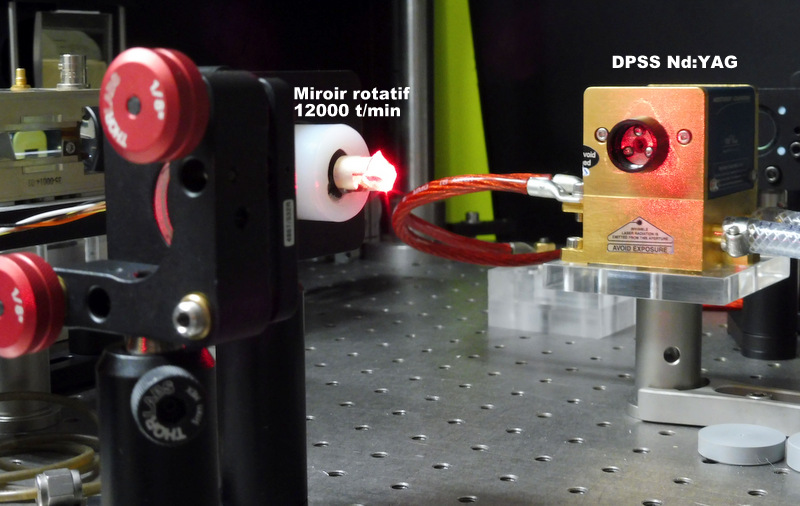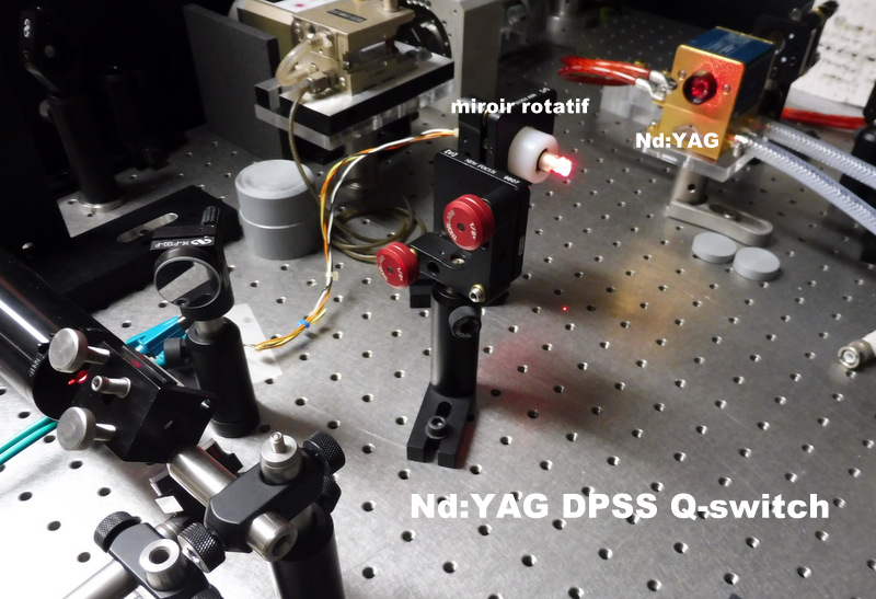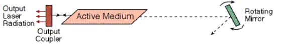 MONTAGE Q-switch avec un prisme rotatif. Le prisme rotatif permet d'obtenir des impulsions ayant une puissance crête plus élevé. Le barreau est pompé en continu et le facteur de qualité du résonateur est maintenu au plus bas pour que l'inversion de population soit la plus élevée que possible.