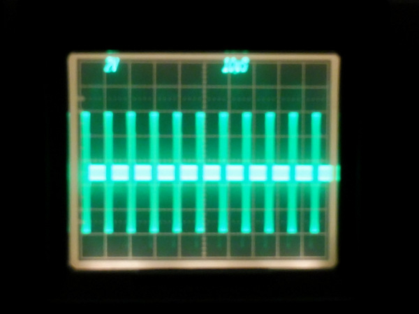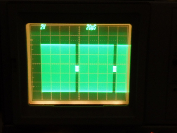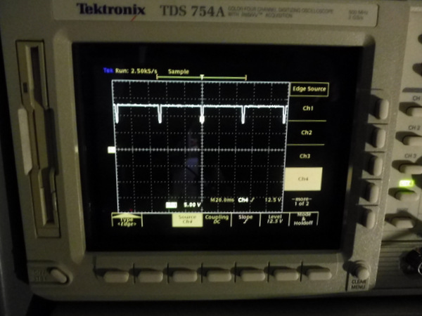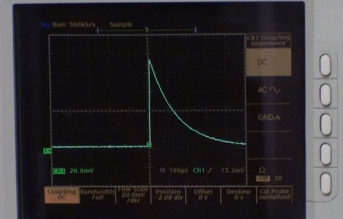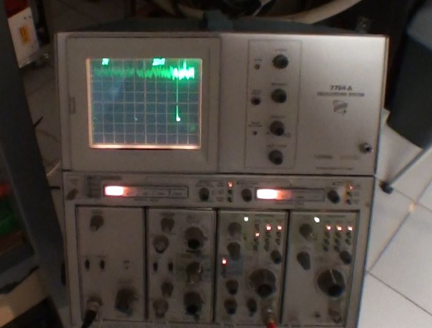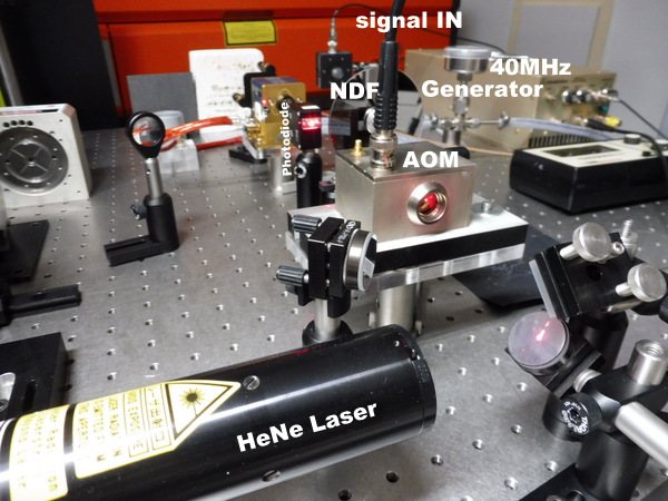 Avant de monter l'AOM dans la cavité laser, je dois vérifier le bon fonctionnement de celui-ci. Pour cela j'utilise un laser HeNe dont le faisceau traverse l'AOM et est récupéré par une photodiode qui me permet de faire le bon réglage de l'angle de Bragg. Les deux photos ci-dessous sont les signaux de sortie monitor du générateur Intra Action Corp. Model QE 27508 f=27.12 MHz 50W. Le signal obtenu sur la photodiode après avoir traversé un filtre gris servant à ajuster l'intensité au niveau de la photodiode de manière à obtenir un signal de l'ordre du volt sur l'oscilloscope TDS 754A. On constate une modulation de 50%