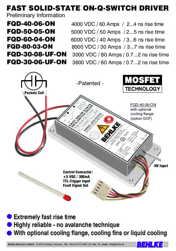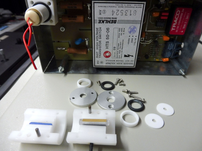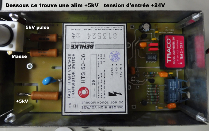 Sous le module BEHLKE HTS 50-06 se trouve une alimentation +5kV NSE Electronic SCHULZ model 590-122. Cette unité sert à faire commuter la cellule de pockels. Celle-ci étant endommagée, je dois retailler les faces du cristal LiNbO3.