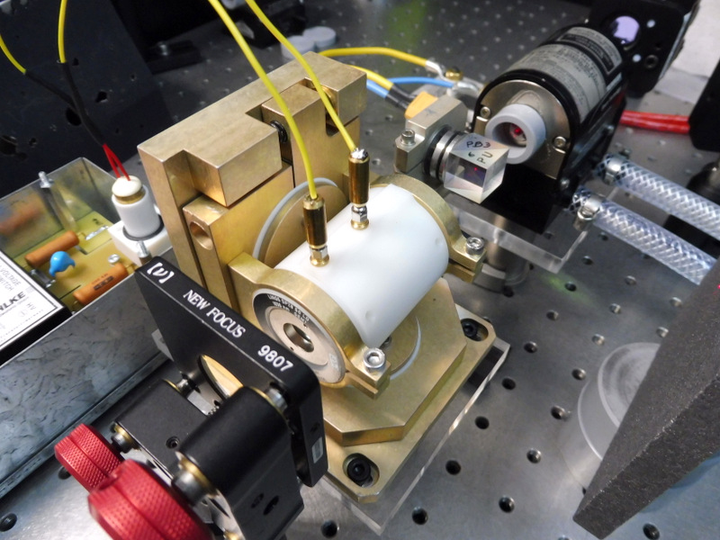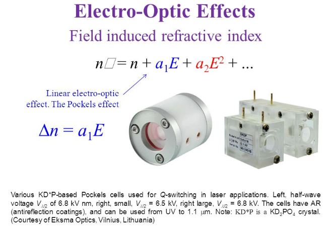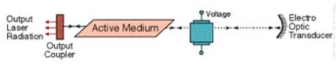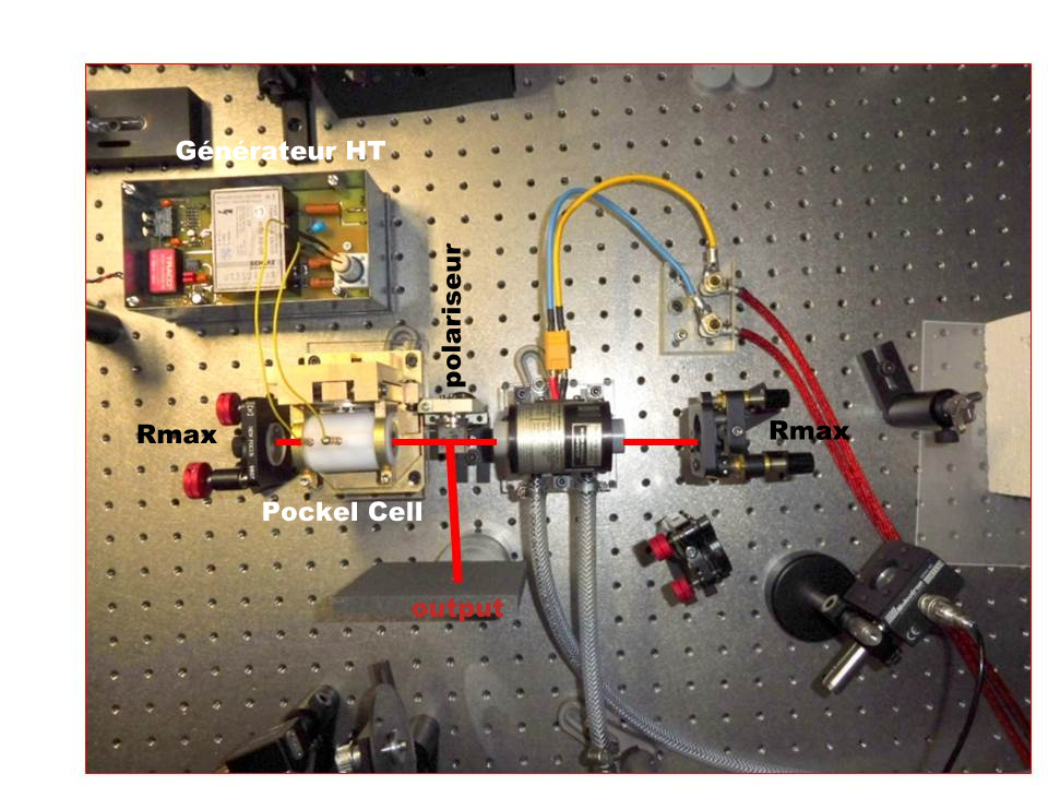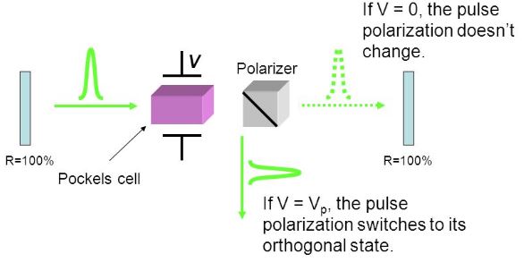 MONTAGE Q-switch avec une cellule de Pockels. Une cellule de Pockels est un élément constitué d'un cristal électro-optique à travers lequel passe la lumière. Deux électrodes sont disposés sur le cristal sur lesquels on applique une tension qui produit un retard de phase de la lumière. La cellule de Pockels se comporte comme une lame d'onde qui peut-être modulée