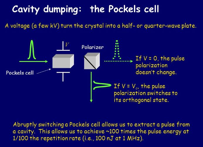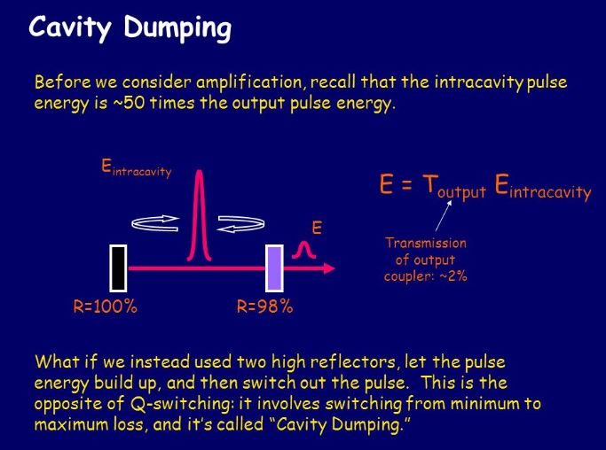 MONTAGE en "cavity dumping". Le montage en "cavity dumping" traduit en français cavité vidangée ! Est le contraire du Q-switching où l'énergie laser est stockée dans le milieu amplificateur (inversion de population) ici l'énergie est stockée dans la cavité laser sous forme d'un champs électrique et lorsqu'on applique une tension sur la cellule de Pockel l'énergie stockée est libérée grâce au polariseur ! La durée de pulse d'un laser utilisant la "cavité dumping" est déterminé par la longueur du résonateur et par la vitesse de commutation de la cellule de pockel.