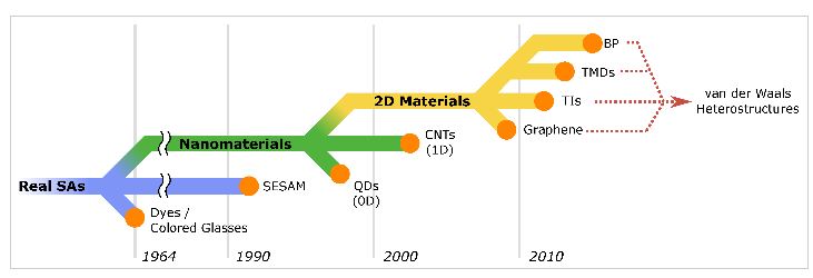 Voici différents types de matériaux et structures 2D utilisables pour faire du Q-switching ou du mode-locking. Les colorants saturables et les verres saturables comme Schott 695 ont étés les premiers utilisés depuis 1964. Les miroirs SESAM sont venus sur le marché vers 1992 surtout utilisé pour le mode-locking des lasers femtosecondes. Début des années 2000 sont apparus les nano-structures 1D et 2D avec toute une série de nouveaux corps permettant de réduire la durée des impulsions laser.