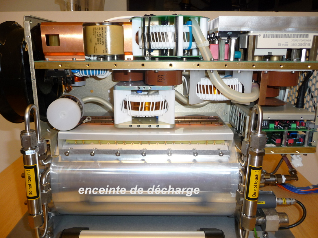 Ce laser se compose de 2 parties bien distincte qui sont: le module électronique de mise en forme de l'impulsion haute tension servant à excité le gaz et l'enceinte de décharge contenant le gaz. Dans l'enceinte de décharge se trouvent les électrodes de décharges en laiton passivée ,les électrodes de pré-ionisation corona en céramique, un échangeur de chaleur gaz/eau, un filtre électrostatique, la turbine faisant circuler le gaz à travers les électrodes de décharges et l'échangeur de chaleur.Sur les deux flasques de fermeture du tube de décharge se trouvent les miroirs plan/plan formant la cavité résonnante. La turbine est entraînée par un moteur électrique muni d'un couplage magnétique.Les électrodes de décharge doivent être usinées et réglées avec une haute précision inférieur à 50 microns pour éviter des décharges prématurées créant des instabilités qui conduisent à des décharges en arcs ce qui empêche le pompage correcte du gaz formant l'excimer donc pas d'effet laser.On constate que ce type de laser n'est pas à la portée des amateurs lasers de part la complexité et la précision et le "savoir faire" nécessaire !