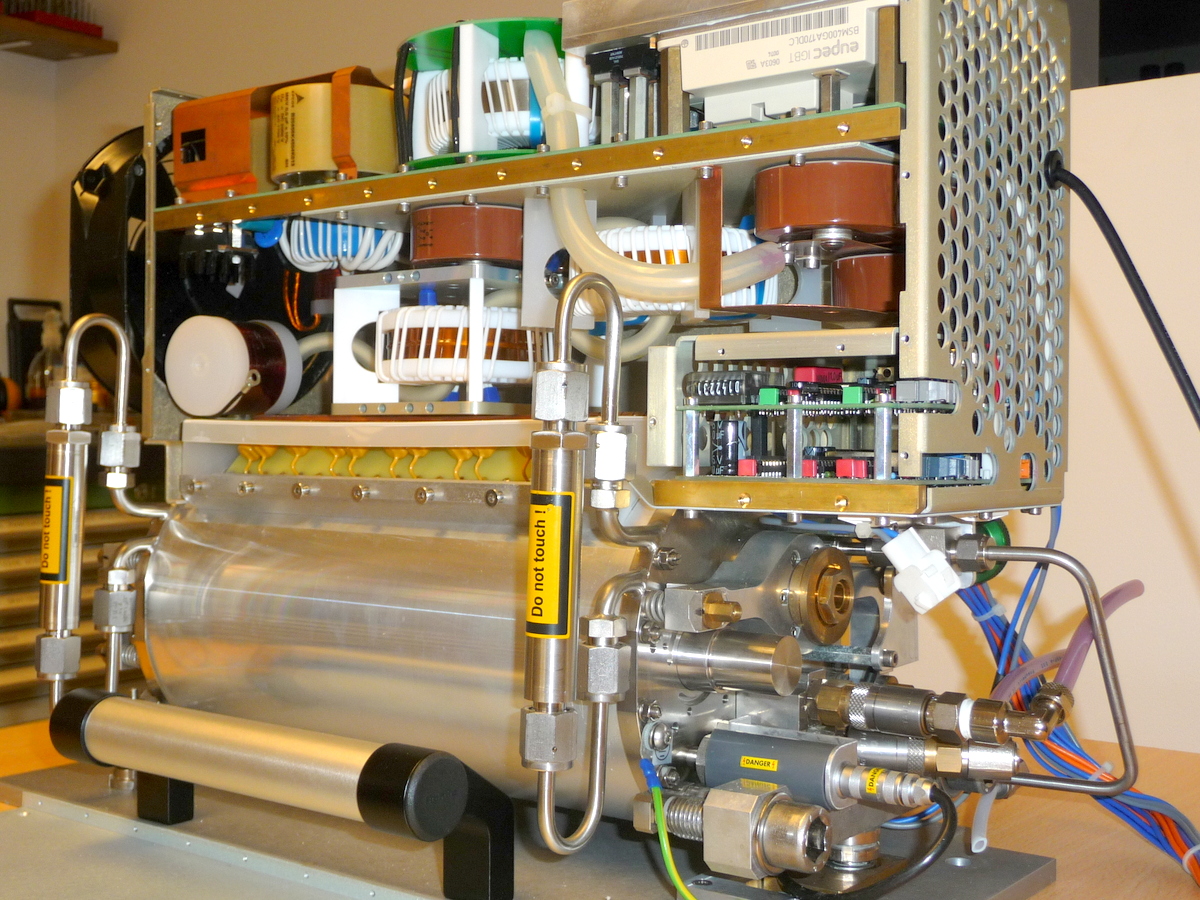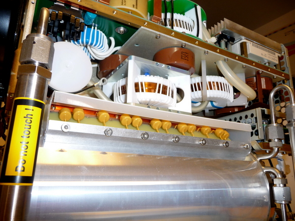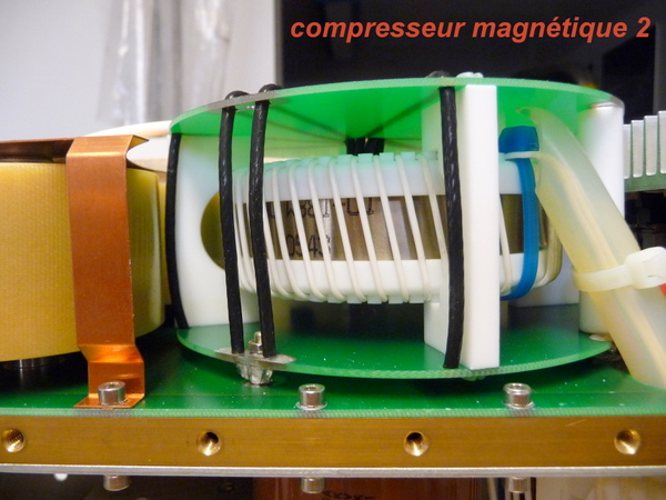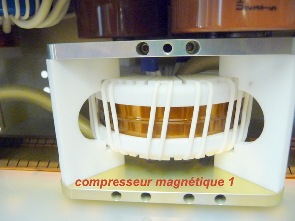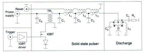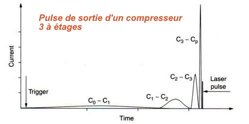 Concernant le circuit de décharge il se compose de 2 IGBT déchargeant un condensateur de 1.5 uF sous 1350V à travers un inducteur magnétique servant également de transformateur élévateur de tension puis suivi de 2 étages de compression (donc au total 3 étages de compression). L'inducteur saturable (self non linéaire) se comporte comme un interrupteur ouvert quand elle n'est pas saturée donc pour un faible courant de passage. Lorsque celui-ci augmente et que l'induction magnétique sature l'alliage amorphe, celui-ci devient conducteur et se comporte comme un interrupteur fermé. Le rapport entre l'inductance saturée et non saturée donne le facteur de compression d'un étage ( environ 5x), donc avec 3 étages on obtient un facteur de compression d'environ 125. La décharge du condensateur Co au moyen des 2 IGBT est de 1 microseconde donc après compression on obtient un pulse de 8ns se qui est une bonne vitesse de pompage pour un laser à excimer.