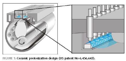 Les électrodes de pré-ionisation sont du type corona.Elles se composent d'une multitudes des pins de chaque coté des électrodes de décharge principales. La décharge au bout de la pointe se fais sur une céramique en titanate de barium qui crée une reptation de la décharge sur sa surface se qui crée de la lumière ultra-violette créant des photo-électrons dans le gaz entre les électrodes de décharges principales. Il faut une densité de 107 à 109 électrons/cm3 pour bien pré-ionisé le gaz.