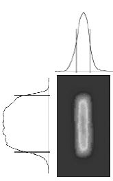 Le profil du faisceau de sortie du laser à 193nm, énergie par pulse 12mJ en 6ns soit une puissance crête de 2MW ceci à 1000 pulses par secondes ! La dimension du faisceau est de 6x3mm avec une divergence de 1.5x3mrad.