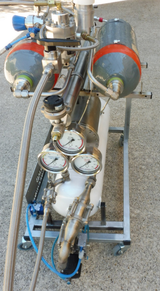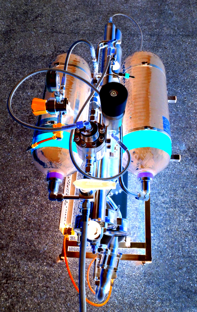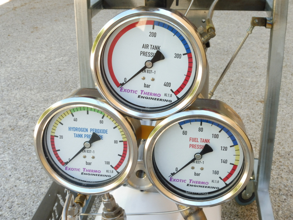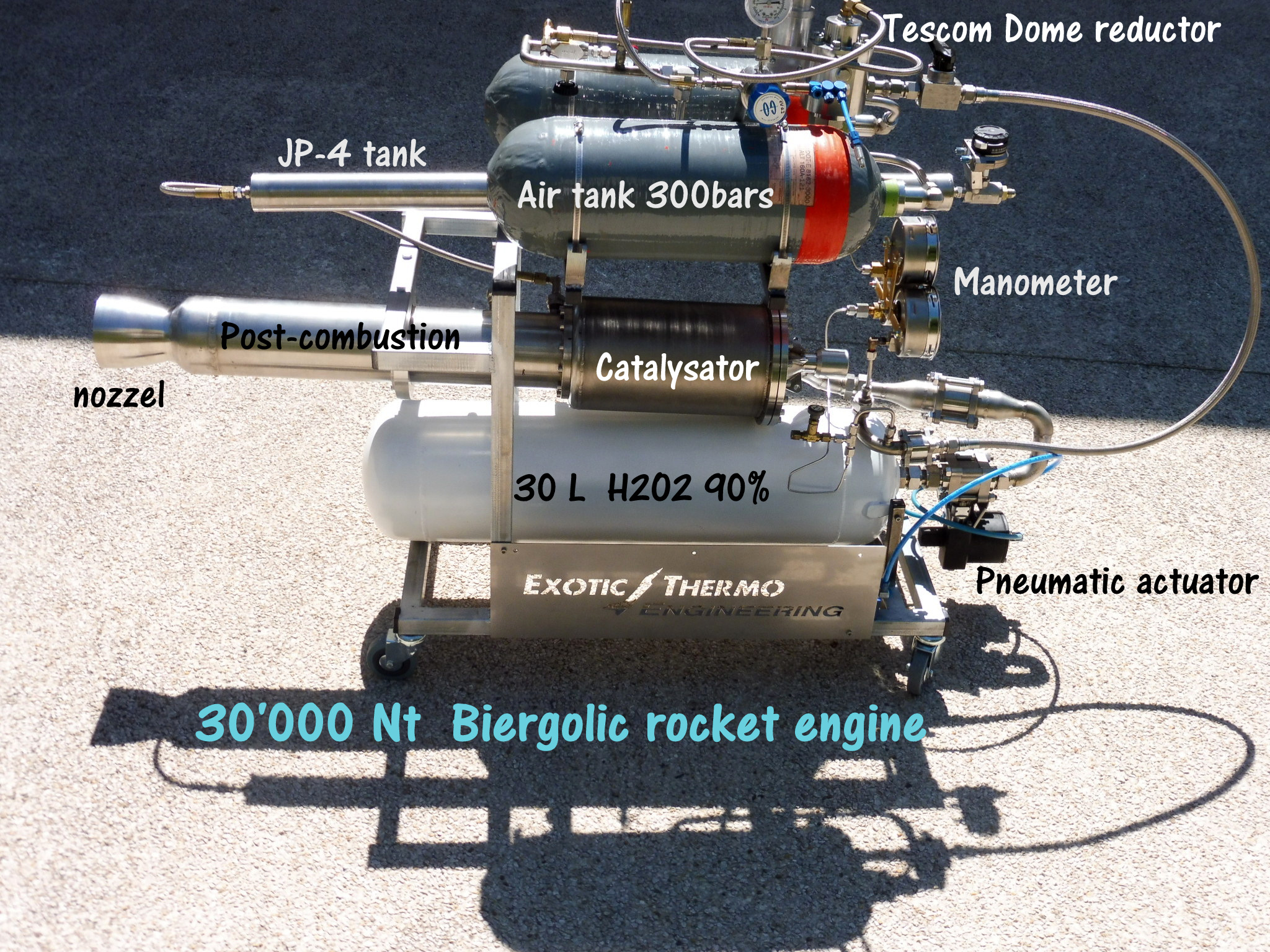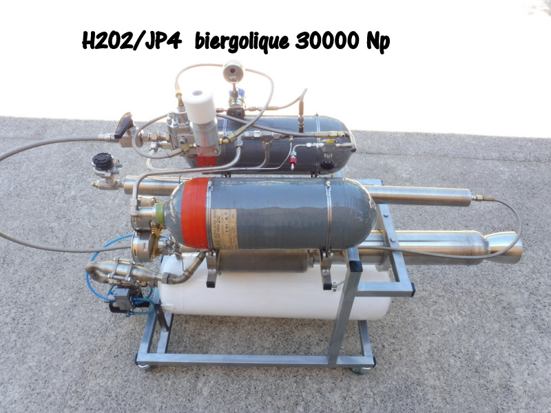 Ce propulseur est composé d'un réservoir en acier inoxydable 316L passivé pouvant contenir 35kg de peroxyde d'hydrogène à 90%. Un second reservoir cylindrique muni d'un piston libre est rempli avec 2.8 litres de JP4 ou kérozène. Lors du départ le peroxyde d'hydrogène arrive sur le catalyseur céramique qui le décompose en vapeur d'eau et d'oxygène à 740 °C. Ces gaz chaud sont dirigé dans la chambre de post-combustion où est injecté à une pression de 135 bars le combustible qui s'enflamme spontanément en contact avec les gaz chaud. La pression du réservoir de JP-4 est obtenu au moyen d'une pression d'azote de 140 bars sur un des cotés du piston mobile.