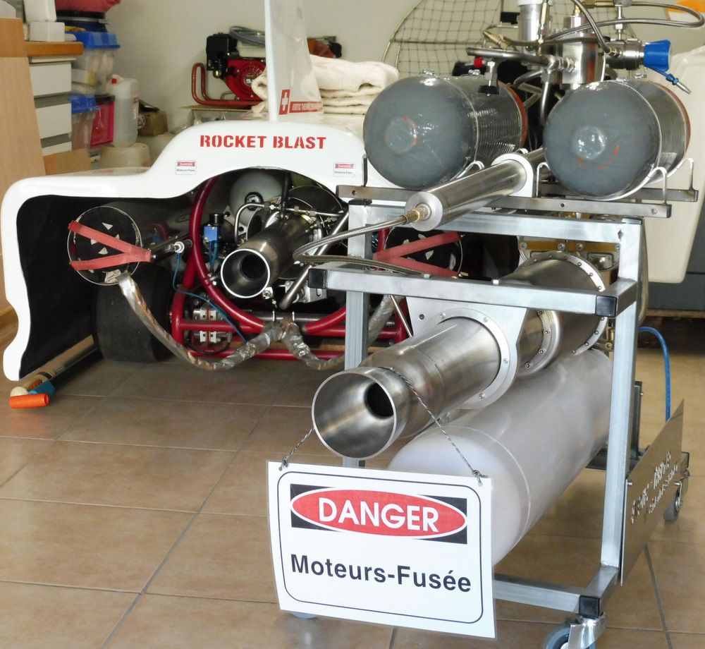 Montage sur un cadre du propulseur de 3 tonnes de poussée qui équipait la moto fusée SPEEDMACHINE II.