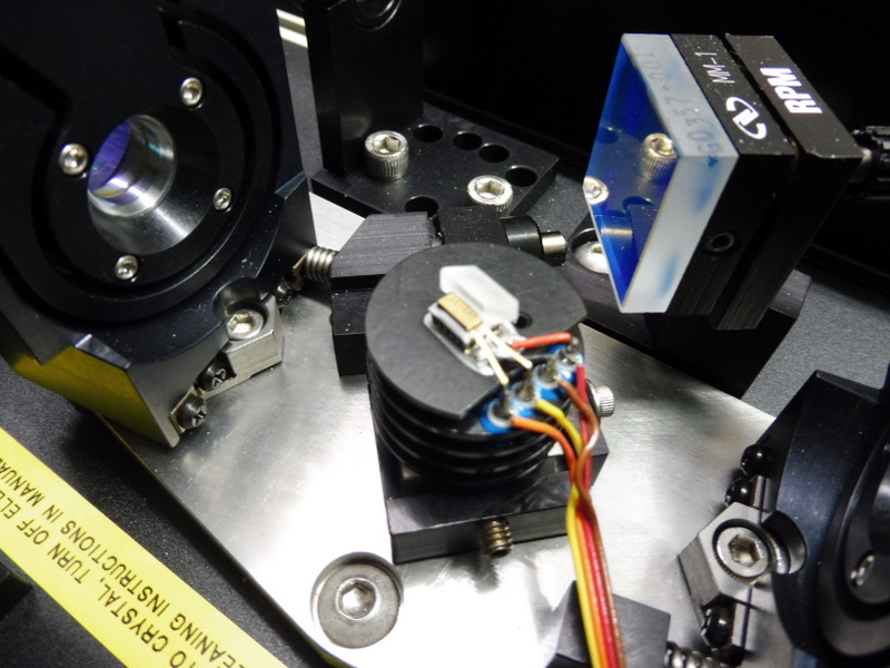 Le cristal non linéaire LBO (Lithium Triborate) avec les 2 faces taillées à l'angle de Brewster monté sur un disque de chauffage thermo-électrique avec une sonde de température pour la régulation de celui-ci. Le pompage peut-être effectué entre 720 et 850nm avec une puissance moyenne de 2W et des pulses de 100fs. L'accord de phase pour ce cristal est non-critique et la température permet de balayer le spectre entre 1.1 et 1.6 micron et l'idler entre 1.6 et 2.4 micron.