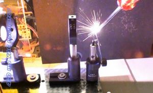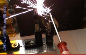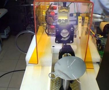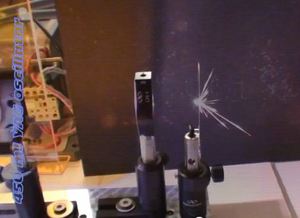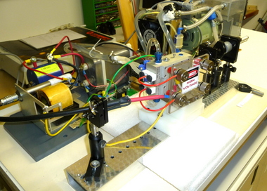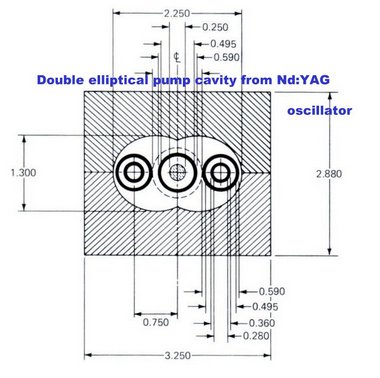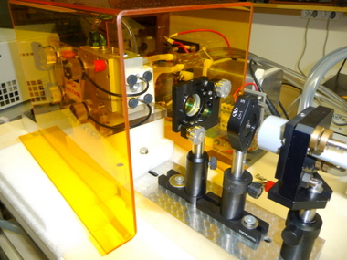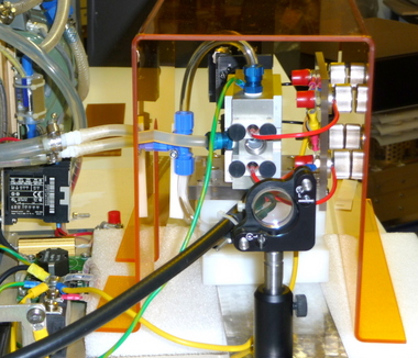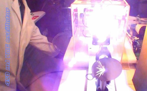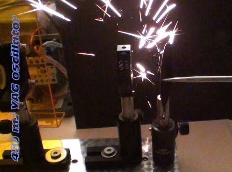Laser YAG:Nd pompé par 2 lampe flash en série dans une cavité double ellipse. Le YAG et les lampes flashs sont refroidies avec un circuit d'eau dé-ionisée. Ce laser donne 450 mJ à 20 pulses par seconde. Dans une autre expérience j'ajoute un même module pour doubler l'énergie de sortie. (oscillateur+amplificateur); Pour simplifier le réglage du résonateur, j'utilise un retro réflecteur (prisme à 3 faces)