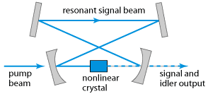 parametric oscillator is a light source similar to a laser, also using a kind of laser resonator, but based on optical gain from parametric amplification in a nonlinear crystal rather than from stimulated emission. Like a laser, such a device exhibits a threshold for the pump power, below which there is