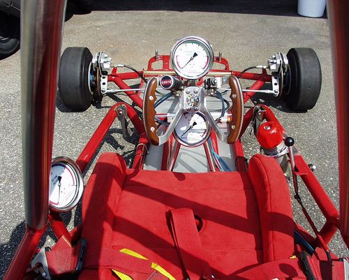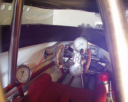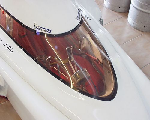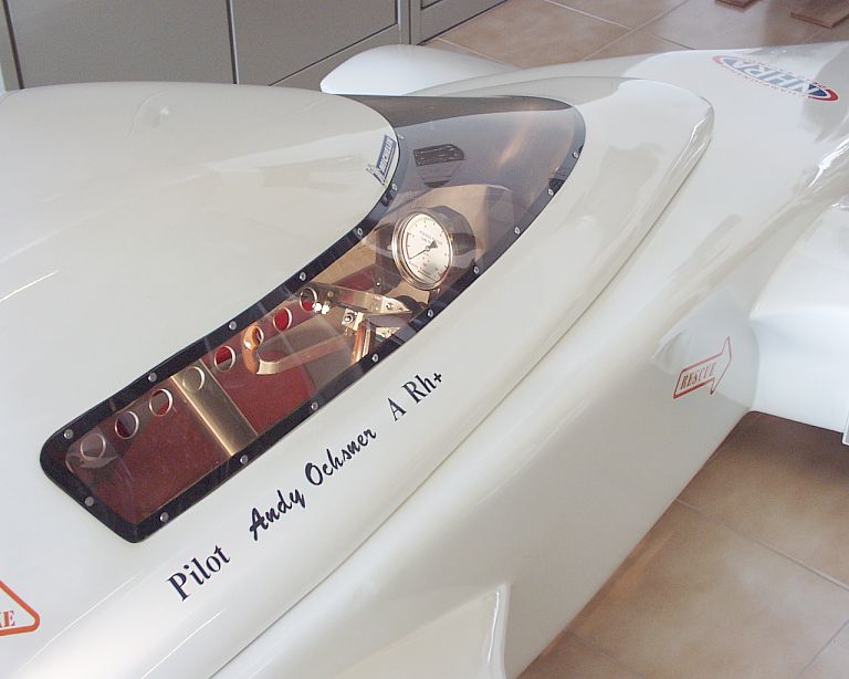 Le poste de pilotage se compose d'un arceau de sécurité de 50 mm de diamètre, d'un siège en carbone-Kevlar® tapissé de tissu en Alcantara. Le volant type "DRAGSTER" peut se détacher de la colonne de direction par une fixation rapide pour que le pilote puisse rentrer dans le copite. Sur le volant se trouve 3 commandes servant à accéléré et freiner l'engin à savoir: Un bouton pression servant à injecté le peroxyde d'hydrogène à 90% 12 litres par secondes dans le catalyseur qui va produire 60'000 litres de gaz à 740 degrés celsius composé d'oxygène pur et d'un peu de vapeur d'eau. Un deuxième bouton pression servant à injecté le JP4 dans la chambre de combustion permettant de doublé la poussée et surtout de diminuer la consommation de peroxyde d'hydrogène de moitié car l'impulsion spécifique passe de 120 à 232 ! Un troisième bouton sert à déclencher l'ouverture du parachute sans quitté les mains du volant. Sur la droite du poste de pilotage se trouve une manette pour déclencher l'ouverture du parachute de secoure . Egalement 3 manomètres pour réglés les pressions avant le "RUN" et un détendeur pour le réglage du peroxyde d'hydrogène qui commande un détendeur à dôme de très grand débit ainsi qu'un détendeur pour le réglage du JP4. Une pédale de frein au pied et une pédale ON/OFF au pied qui coupe le carburant en cas de problème!