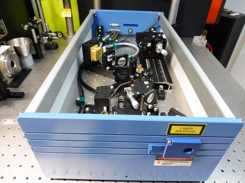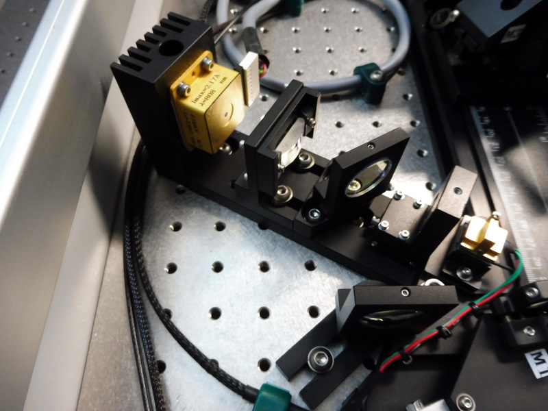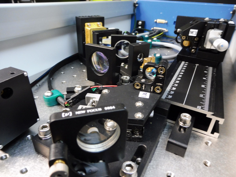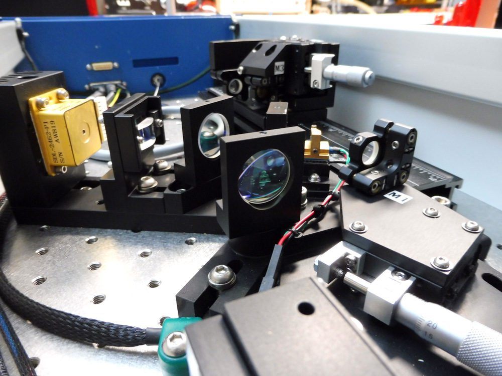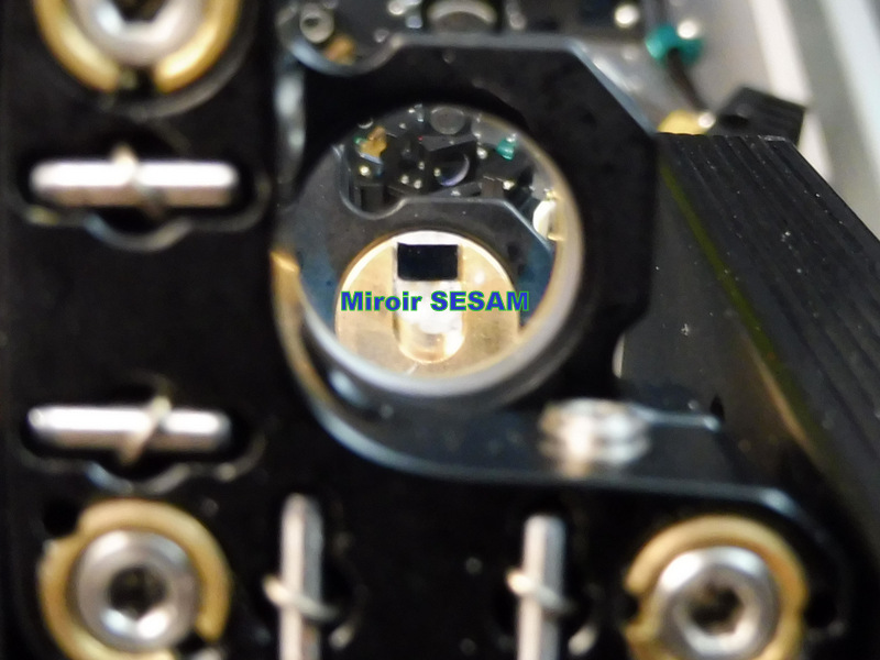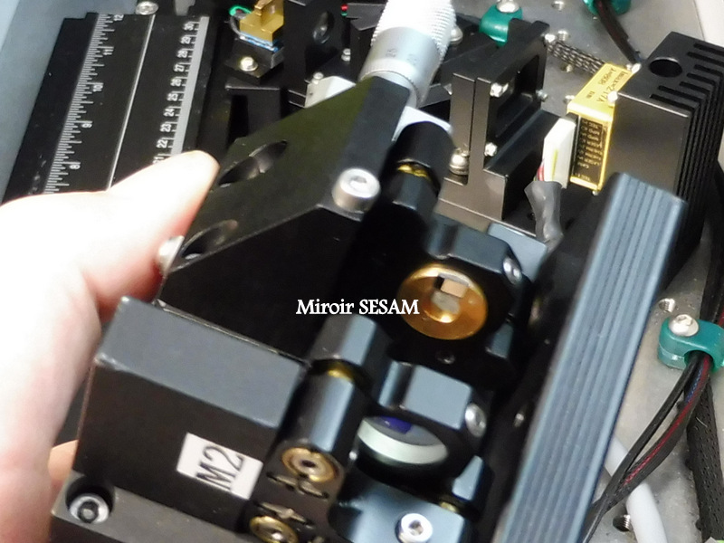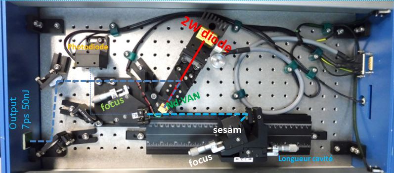 La diode laser de 2.2W pompe un cristal Nd:VAN monté sur un TEC. La cavité laser est formée par un miroir OC 5% pour 1064nm sur la face de pompage du cristal et le miroir SESAM. La durée du pulse et la fréquence de répétition est régler de manière grossière par le déplacement du SESAM sur la glissière graduée. Le réglage fin se fait au moyen d'une vis micrométrique. Un second réglage micrométrique permet de concentré plus ou moins le rayon laser sur le miroir SESAM de manière à réalisé le seul de l'auto-modulation pour que le laser donne des pulses picosecondes.