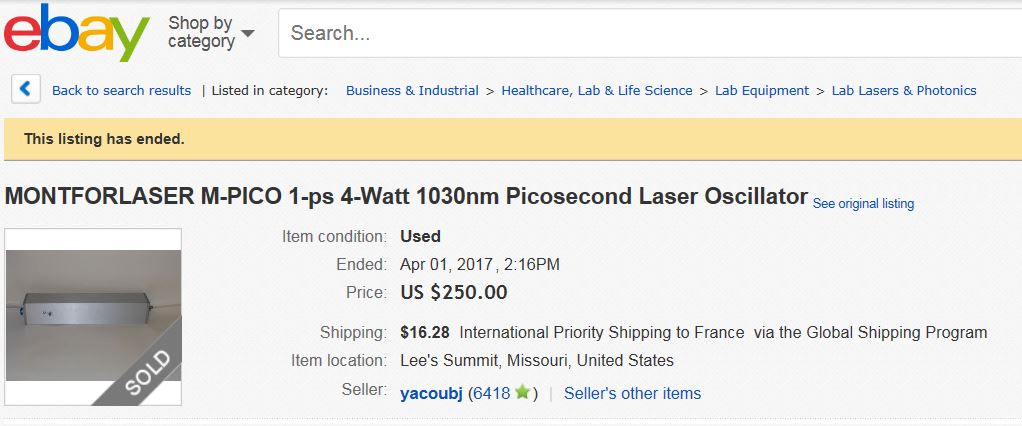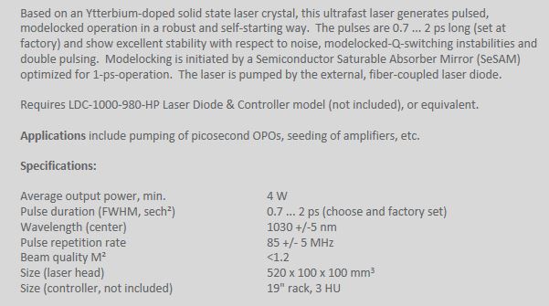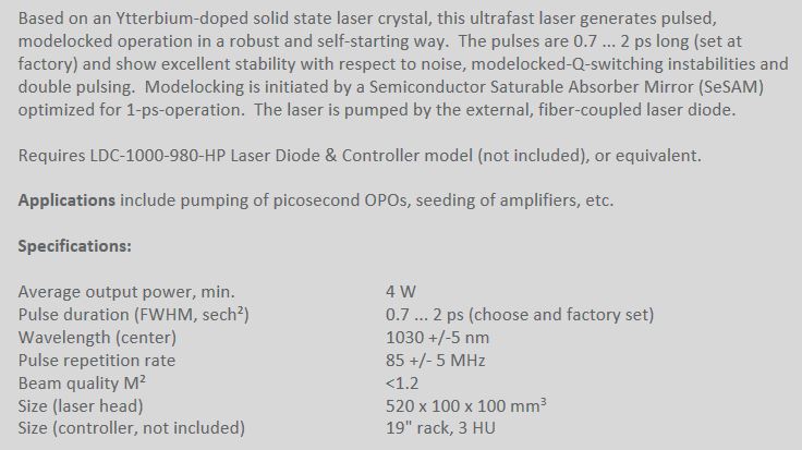 Ce laser à été développé par la société MONTFORT Laser GmbH fondée en 2011 par le Dr.Daniel Kopf, fondateur et CEO de la société HIGH Q GmbH racheté par NEWPORT Co. Le laser est basé sur un cristal YAG dopé à 0.1% d'Ytterbium pris en sandwich entre un résonateur formé d'un miroir SESAM permettant de faire un blocage des modes longitudinaux et d'un miroir de sortie OC laissant passé le faisceau pompe issue d'une diode laser de 60W à 980nm et présentant un coefficient de réflexion de 90% pour 1030nm longueur d'onde du laser picoseconde. La diode laser pompe se trouve externe au boitier laser et est amener par une fibre optique sur la tête laser. Ce laser je l'ai acheter sur Ebay pour 350$ il faut espéré que le cristal n'est pas abîmer sinon il sera inutilisable car le prix d'un tel cristal doit avoisiner les 5000 à 6000 euro !
