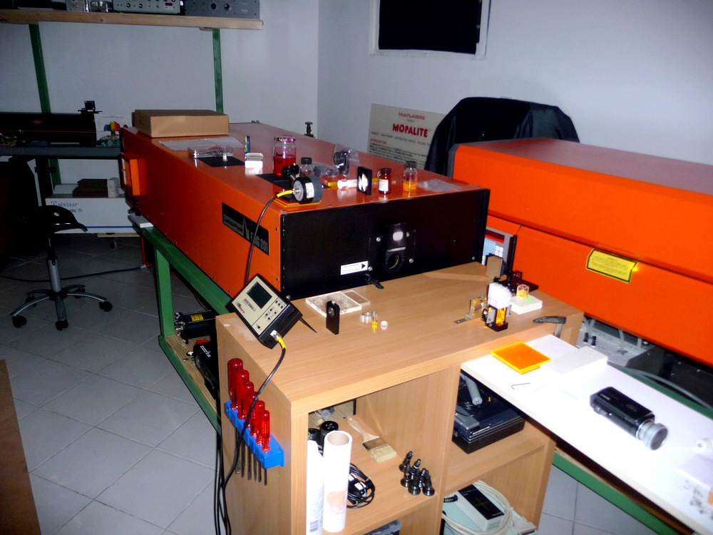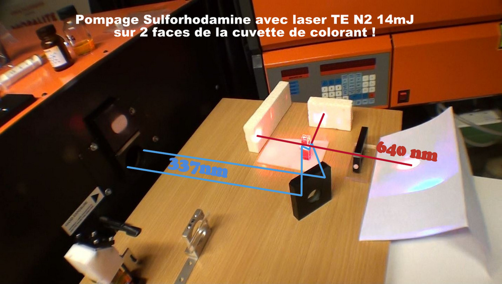 Cette expérience consiste à pompé une cuvette de colorant simultanément sur 2 faces ce qui permet d'obtenir 2 faisceaux orthogonaux. La solution se compose de sulforhodamine B ou "KITON RED" dissous dans de l'éthylène glycol à une concentration de 2.10-3 Mol. Le laser pompe est un LAMBDAPHYSIK EMG201 travaillant avec un mélange de 960mbars d'hélium et 40mbars d'azote en attendant de recevoir le gaz pour travailler en excimer XeCl avec une énergie de sortie de 600mJ soit 50 fois plus que maintenant !