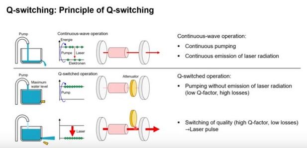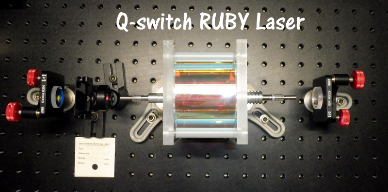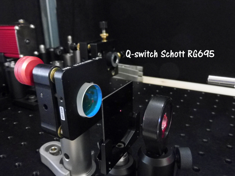 Le déclenchement du laser à rubis par un filtre SCOTT RG695 se comportant comme un absorbant saturable. Lors du pompage optique dès que le rubis atteint le seuil laser (système à 3 niveaux) c'est à dire que la moitié des ions de chrome sont excités, alors il faut évité que le rubis se mette à laser on bloque le résonateur de manière que l'inversion de population augmente à son maximum. Pour cela on utilise un absorbant saturable qui empêche que l'onde laser s'amplifie lors des passages successifs. Ceci permet d'obtenir une inversion de population plus importante et de générer une impulsion géante !