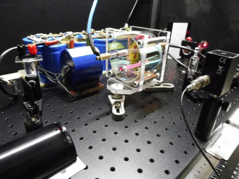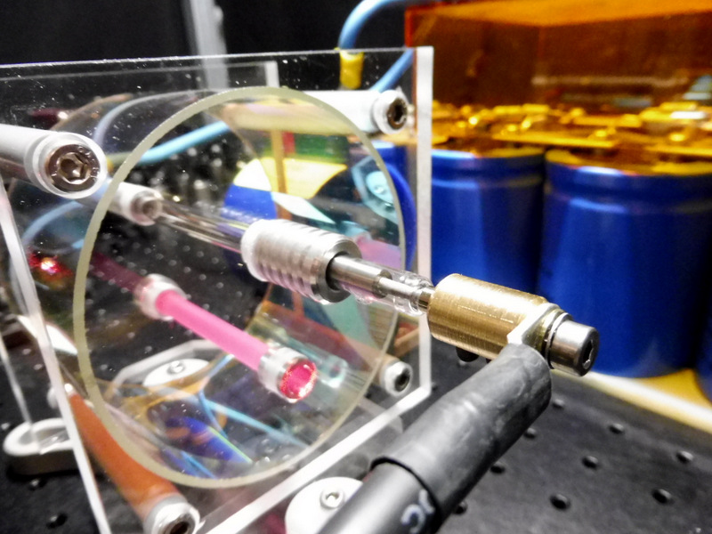 Le rubis dopé à 0.035% Cr+3 de diamètre 7mm et 70mm de longueur peut stocker une énergie de 2.18J/cm3 donc une énergie en mode relaxé au mieux de 5.3J. Le seuil de pompage en réflecteur elliptique est de 100J/cm3 soit 270J ! Maintenant la préparation du banc de condensateurs électrolytique et de la self et mesure du temps de décharge au moyen d'une photodiode au silicium avec un filtre atténuateur.