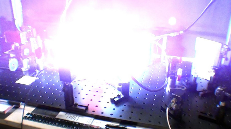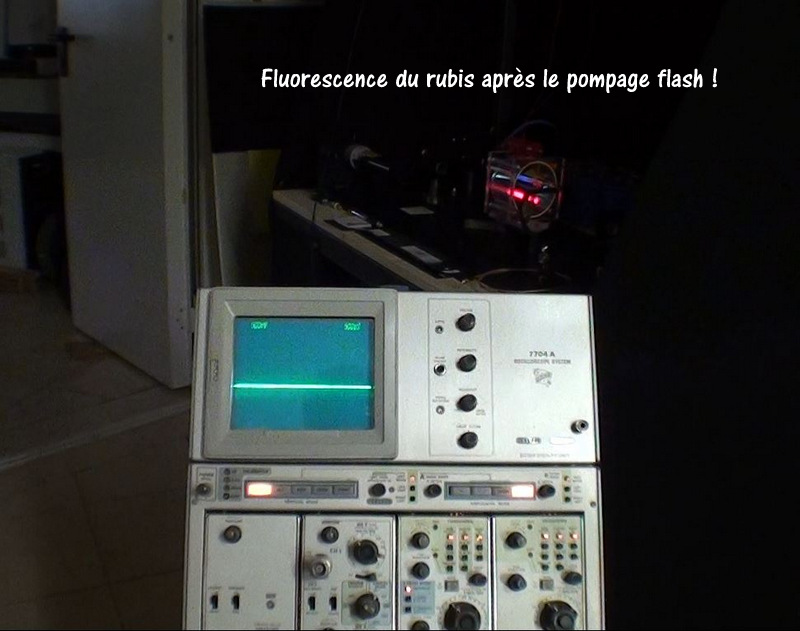 Sur la photo ci-dessous on vois des restes de fluorescence du rubis à environ 50ms après la fin du pompage flash !