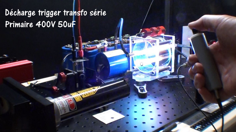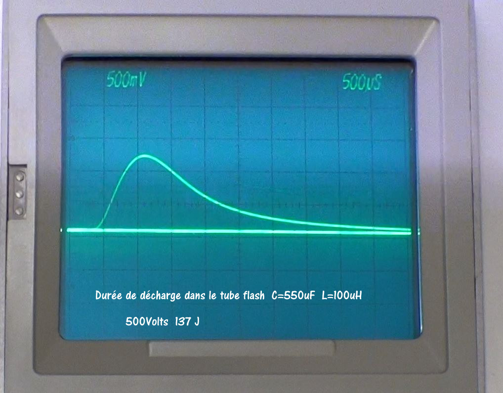 Avec ce banc de condensateur électrolytique d'une capacité équivalente de 550uF et un transfo série d'allumage du tube flash qui présente une inductance de 100uH la durée de l'éclair flash est de 1,2ms à mi-hauteur ce qui est une bonne valeur pour le pompage du rubis qui à une durée de fluorescence de 3ms.