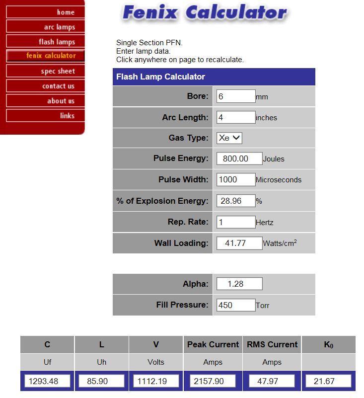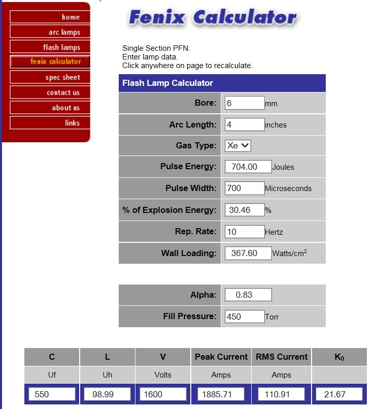 TRAVAIL EN MODE RELAXE La première opération consiste à pourvoir le tube flash d'une batterie de condensateur. La durée de fluorescence pour le rubis est de 3 millisecondes donc une durée de décharge de 1 milliseconde est une bonne valeur qui permet une durée de vie du tube flash plus longue pour une énergie donnée. Un autre avantage est de pouvoir utiliser des condensateurs électrolytique qui présentent une grande inductance interne et une grande énergie de stockage pour un volume réduit. Comme le laser n'est pas pourvu d'un refroidissement et qu'une fréquence de répétition de 1 pulse par minute convient parfaitement à ce type de condensateur. Le tube flash 043-13-m122889 dont je ne connais pas les caractéristiques, mais que je peux comparer à un model de même longueur d'arc 100mm et de diamètre 7/6mm. L'énergie d'explosion d'un tube similaire pour une décharge de 1ms est de 2400 Joules ! L'énergie de décharge pour une durée de vie de 1000 pulses est de 45% Eexpl pour 10'000 pulses 35% pour 105 pulses de 27% et 20% pour 106 pulses. Détermination du banc de condensateurs électrolytique, de la tension de charge et de la self avec le calculateur FENIX
