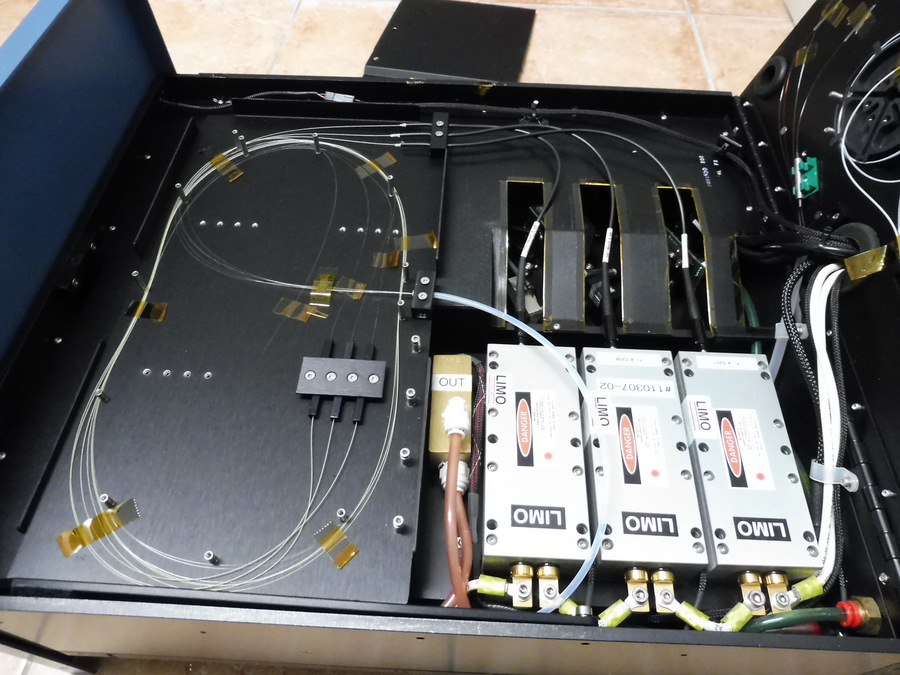 Etage amplificateur à fibre pompé par 3 diodes lasers LIMO de 60W cw à 1470 et 1532nm. Pour pomper optiquement un cristal d’Er:YAG avec une diode laser, on peut utiliser une diode InP (phosphure d’indium) à 1470 nm ou à 1532 nm. Puisque l’ion erbium présente des sections efficaces d’absorption et d’émission importantes à 1532 nm, il est possible de pomper un cristal Er:YAG grâce à un laser à fibre dopée erbium.