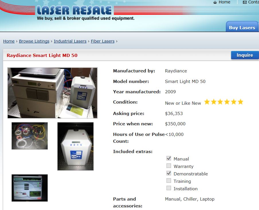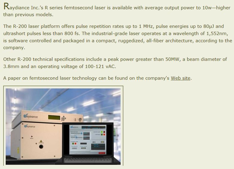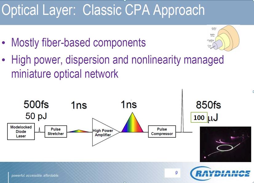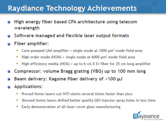 Cet effort a été financé par l'Agence des projets de recherche avancée de la Défense.(DARPA) En 2007, Raydiance a lancé son premier produit, un laser pulsé femtoseconde de bureau. La société a cessé ses activités en juillet 2015. Les actifs de Raydiance Inc ont été acquis par Coherent Inc en août 2015.