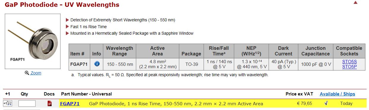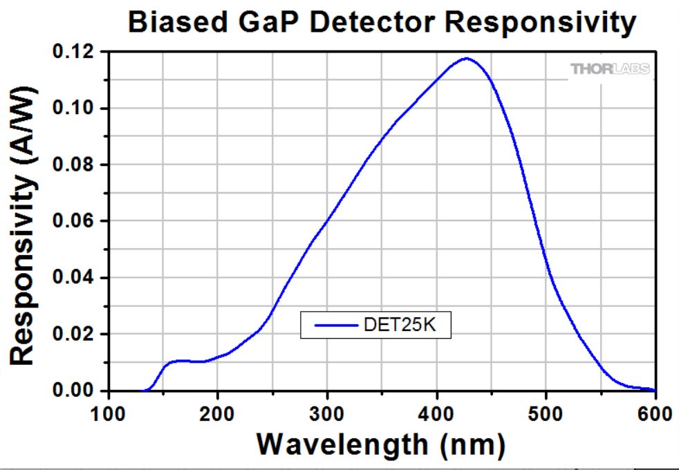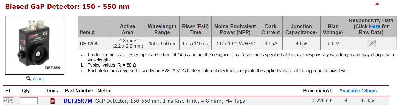 La société THORLABS à proposé de nous fournir les composantes nécessaires pour réaliser cette autocorrélateur interférométrique du second ordre avec leur détecteur DET25K qui contient une diode GaP avec une surface réceptrice de 4.8mm2et une capacité de 1000pF @ 0V.