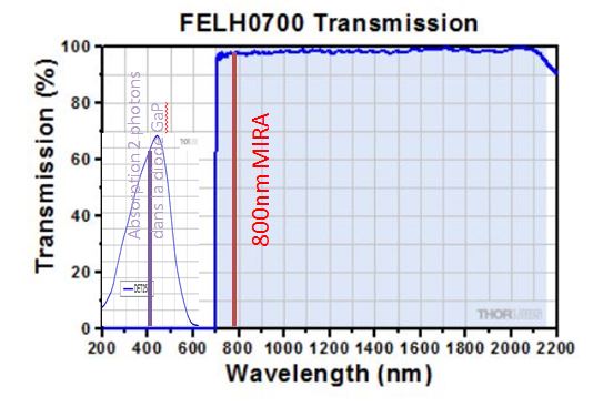 Seuls les impulsions à 800nm traverseront donc le filtre interférentiel puis seront concentrées au moyen d'un objectif de microscope à grande ouverture numérique sur la photodiode GaP. L'énergie de la bande interdite pour l'absorption de 2photons à 800nm est situé à 400nm (3,2 eV) avec une sensibilité de 0.11A/W. Avec cette diode il doit aussi être possible de travaillé avec de l'absorption à 2 photons entre 600nm jusqu'à 1050nm! Ce qui permettrait de faire des mesures sur des lasers à colorant tel que RhodamineB, Kiton Red, oxazine750, Pyridine2 , laser Titane saphir, YAG:Nd.