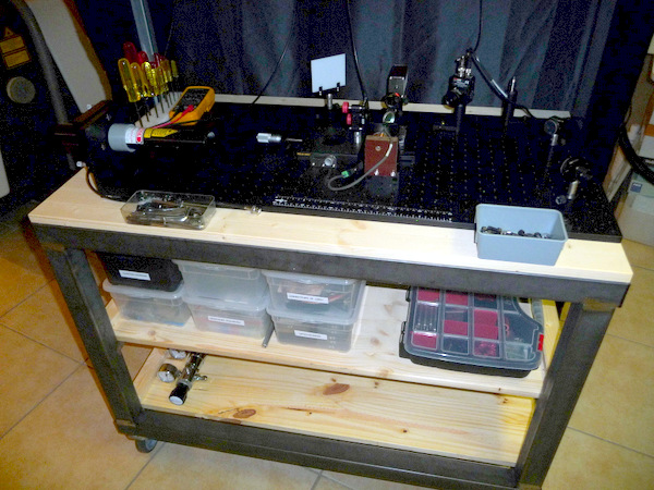 Un interféromètre de MICHELSON qui permet de faire interférer l'onde à analyser avec l'onde de référence pour cela on déplace un des miroirs d'une distance Lm1 qui dépend de la durée du pulse laser à analyser. Cette distance est de 150 microns pour un pulse de 1ps et de 15cm pour un pulse de 1ns (1000ps) Pour faire ces mesures j'ai réalisé un banc de mesure sur une table optique mobile permettant de la déplacer à coté du laser à mesurer.