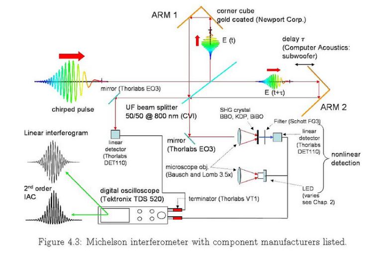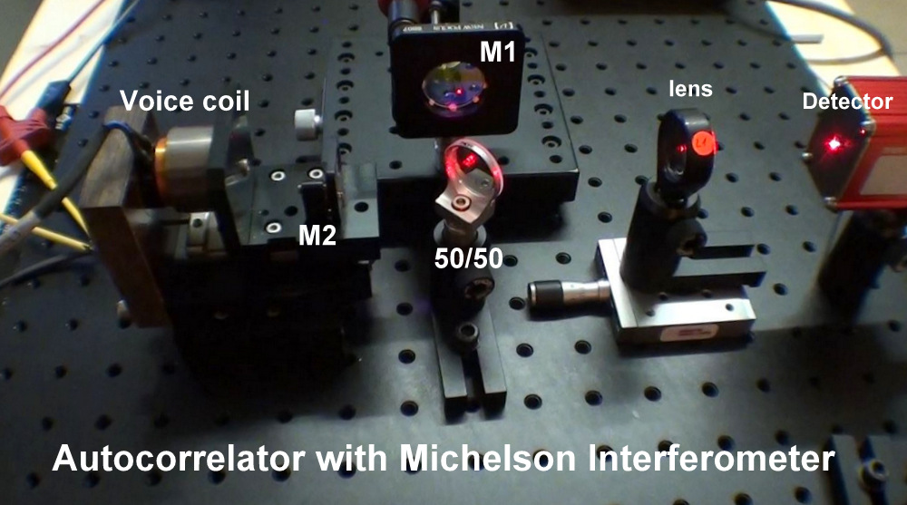 Dans notre montage final un laser accordable Titane:Saphir MIRA900, réglé à 800nm, fournit des impulsions de lumière de 120fs FWHM. L'impulsion pénètre dans l’interféromètre, elle est divisée en deux impulsions d'intensité égale par une lame séparatrice 50:50. L'une des impulsions est réfléchit par un miroir triprism fixe, l'autre impulsion est aussi réfléchit par un miroir du même type, mais celui-ci est mobile, mu d'avant en arrière le long du chemin optique par un voice-coil à une fréquence de l'ordre de quelques dizaines de hertz. Cela permet donc de décaler temporellement, à volonté, l'une des impulsions par rapport à l'autre lors de la recombinés par la séparatrice. De plus cette recombinaison se fait de façon colinéaire, comme on peut le voir sur le schéma, la somme des deux champs permettant ainsi le phénomène d'interférence. Ce champs résultant est ensuite envoyé sur la photodiode qui converti celui-ci en un signal électrique. Ce signal électrique est le résultat d'un processus de conversion non-linéaire au sein de la photodiode qu'on peut exprimer mathématiquement en disant que le signal d'autocorrelation S(tau) est égale à l'intégrale du module au carré de la somme au carré du champ issu du miroir fixe et du champ retardé issu du miroir mobile (cette explication nécessite un développement que nous ferons plus tard). Lorsqu'on trace ce signal S(tau) en fonction de tau, on obtient une figure ( voir sur l'image) dont l'enveloppe à mi-hauteur permet, si on a au préalable une idée de la forme de l'enveloppe de l'impulsion issu du laser, de déduire la durée à mi-hauteur (FWHM) de cette dernière et donc d'estimer de façon assez précise la durée de l'impulsion laser.