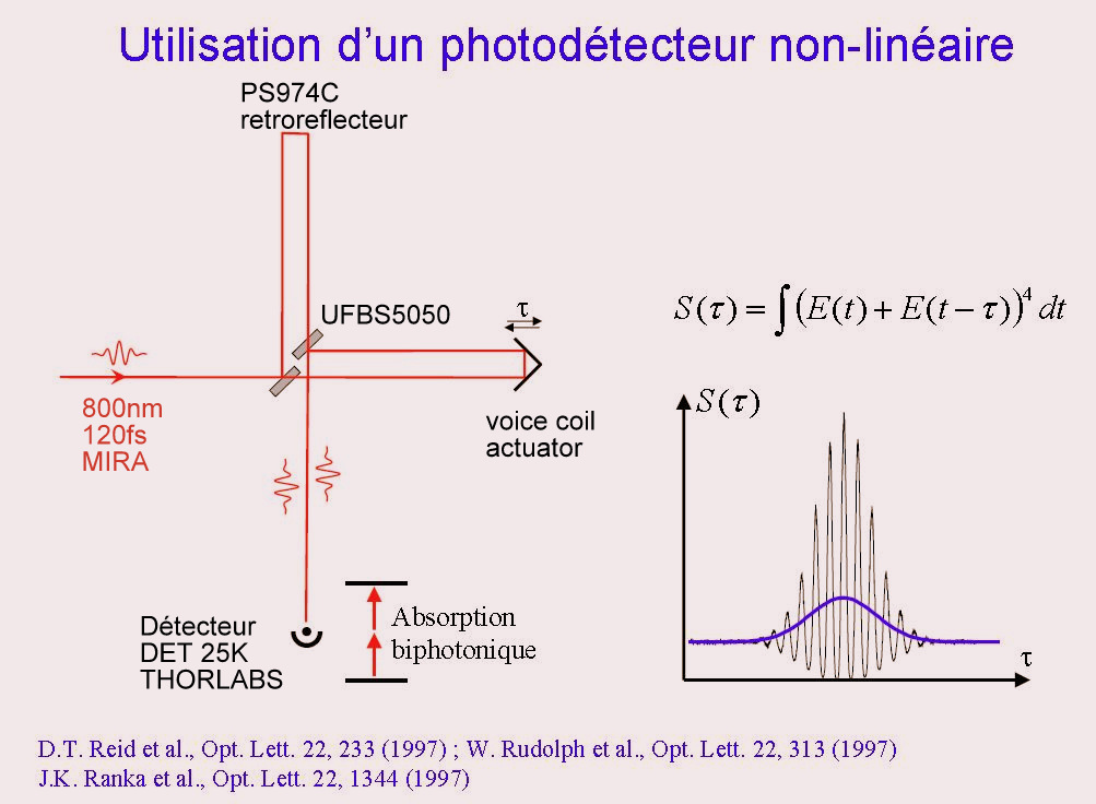 Introduction Mesurer avec une photodiode la durée d'une impulsion de lumière produite par un laser femtosecondes (1fs=10-15s) est impossible en soumettant directement celle-ci aux impulsions. En effet le temps de réponse des meilleurs photodiodes commercialisées aujourd'hui permet de caractériser des pulses de l'ordre de 200ps, donc très loin de la rapidité dont nous avons besoin !