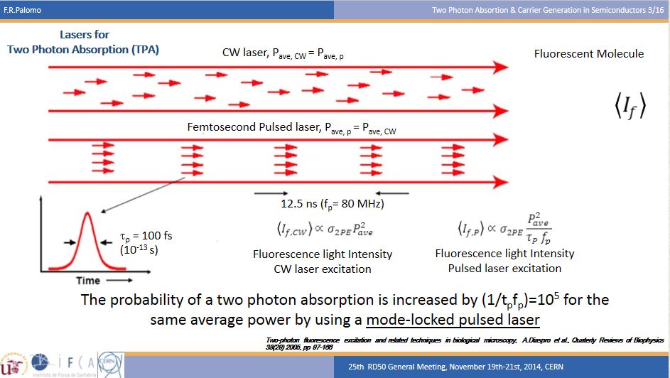 Pour que l'absorption à 2 photons se produise dans le semi conducteur, il faut que 2 photons soient ensemble au même endroit et en même temps (RENDEZ-VOUS SPATIO-TEMPOREL) La possibilité de la rencontre des 2 photons est limitée dans le temps par la durée de vie de l'état virtuel qui est de 100 attosecondes (1atto=10-18s). Pour augmenter la chance que les 2 photons se rencontrent il faut DONC deux conditions : 1- au niveau temporel il faut réduire la durée d'émission tout en conservant le nombre de photons donc le flux photonique (W/cm²) 2- au niveau spatial il faut réduire la surface d'éclairement au moyen d'une lentille ! En jouant sur ces 2 facteurs, avec un laser pulsé on augmente la probabilité d'interaction des photons d'un facteur 105 à 106 par rapport à celle obtenue avec un laser continu.