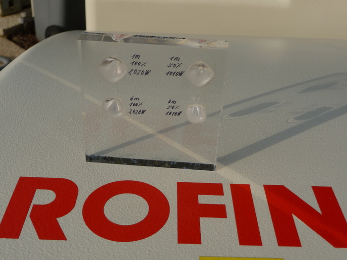 Durant une seconde le faisceau laser à une distance de 1 mètre et 6 mètres est absorbé par une plaque de plexiglass à 1010W (50%) et à 2020W (10%) ce qui permet de visualisé le mode et la concentration en énergie du spot laser à 10600 nm.