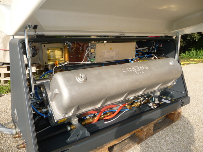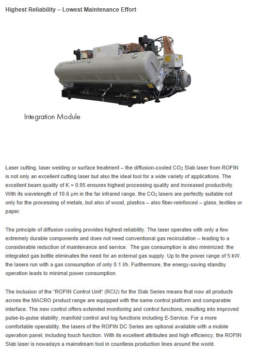 L'autre avantage est qu'il ne nécessite pas de circulation de gaz à haute vitesse pour le refroidissement car celui-ci se produit par diffusion de conduction sur les électrodes de décharges refroidie par eau. Les électrodes de décharges mesurent 100cm de long x 10cm de large et 4 cm d'épaisseur. La distance entre les 2 électrodes est de 2,2 mm. Pour obtenir une décharge homogène qui ne se transforme pas en arc il est nécessaire de changer la polarité des électrodes 100 millions de fois par seconde.(100MHz)