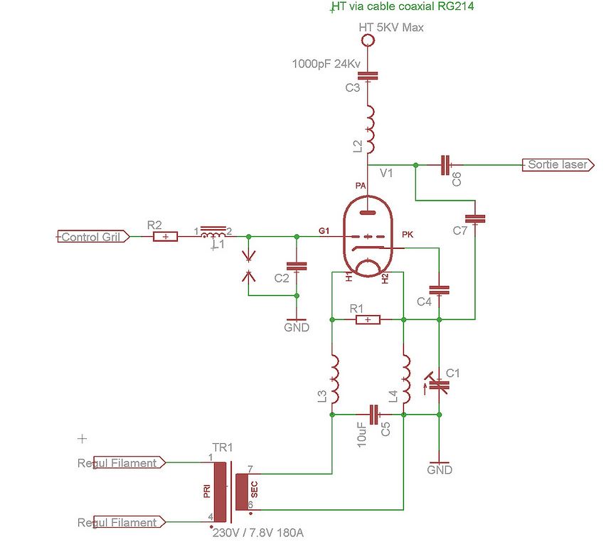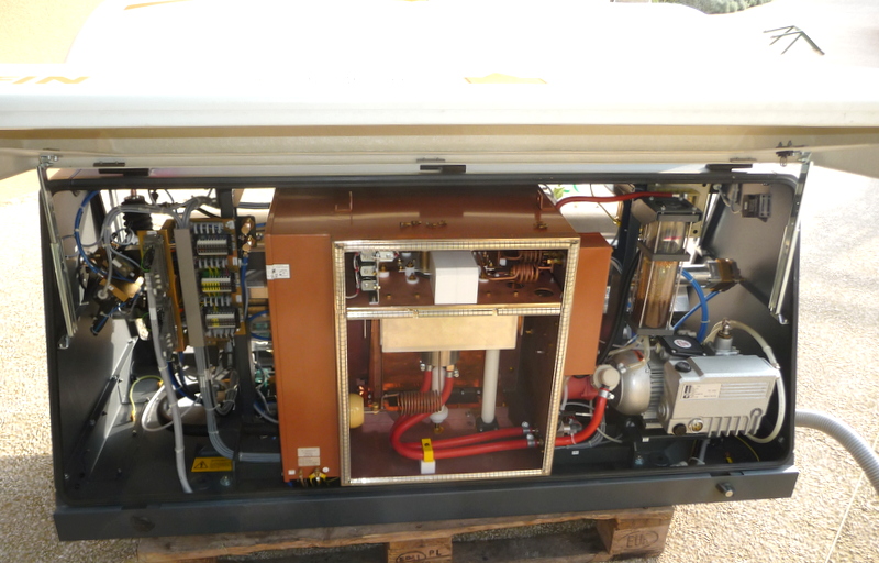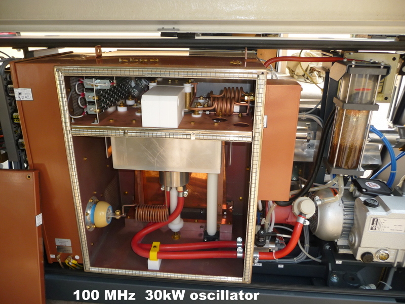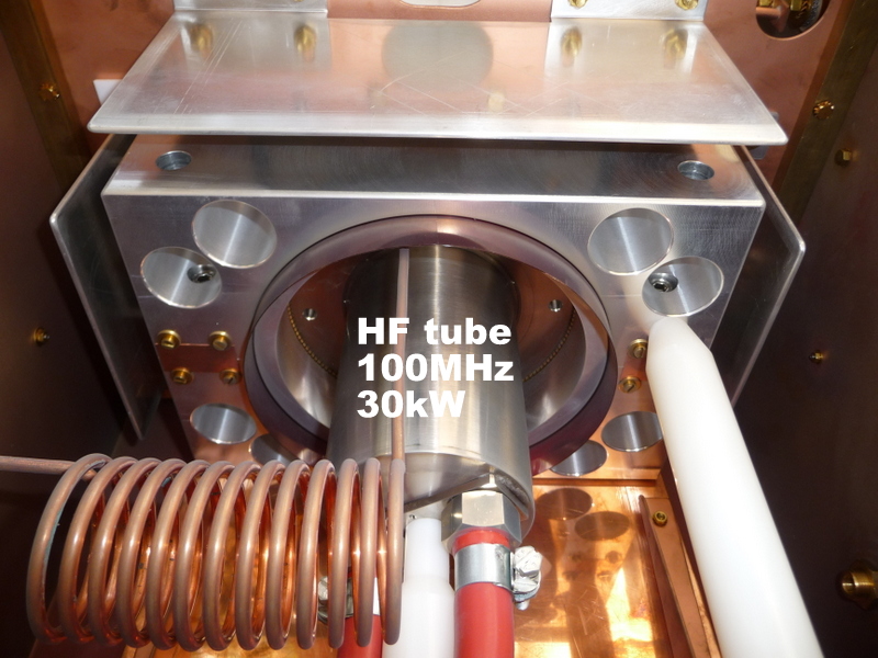 Générateur HF de 30kW à 100MHz permettant d'alimenter les électrodes de décharge. La triode est alimentée par un source de courant de 6A sous 5kVDC !