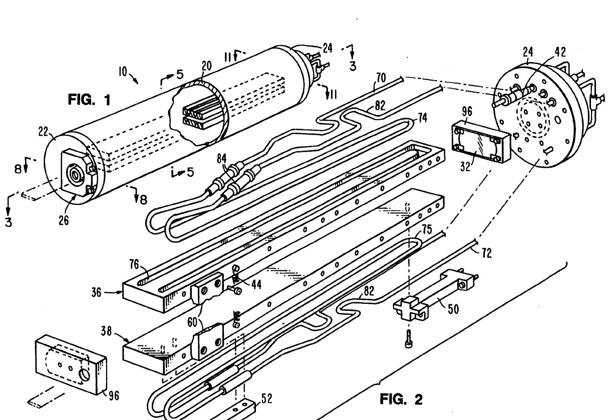 voici la vue intérieur du tube laser (20) en aluminium.Les flasques (22) et (24) eu acier inoxydable ferme le tube par des joints en INDIUM et il font également office de support de miroirs réglable par l'extérieur. Les conduites (74) et (75) servent à refroidir les électrodes de décharges (36) et(38) en aluminium. Les espaceurs (60) maintiennent les électrode de décharge à la distance de 2mm.