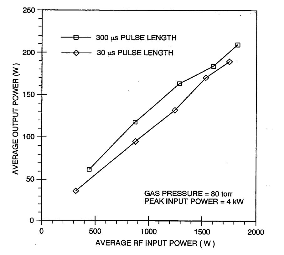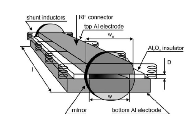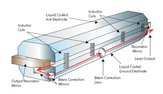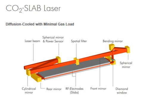 La distance entre les électrodes de décharges dans ce laser est de 2mm, dans cette axe le rayonnement est réfléchit sur la surface par l'angle rasant que fait la lumière. Dans l'autre axe la largueur des électrodes de décharge est de 44mm et là le rayonnement obéit à la loi de la propagation d'onde dans un espace libre. La longueur des électrodes de décharges est de 800mm ! La pression de travail est de 120 torr soit 10x plus élevée que dans un laser conventionnel à décharge longitudinal. Ce qui veut dire, que la longueur de la cavité est multipliée par 10 également ! Voilà pourquoi un laser d'aussi petite dimension est si puissant. Ce laser est capable de couper de la tôle acier inoxydable de 3.2mm d'épaisseur à un vitesse de 1 mètre par minute !!