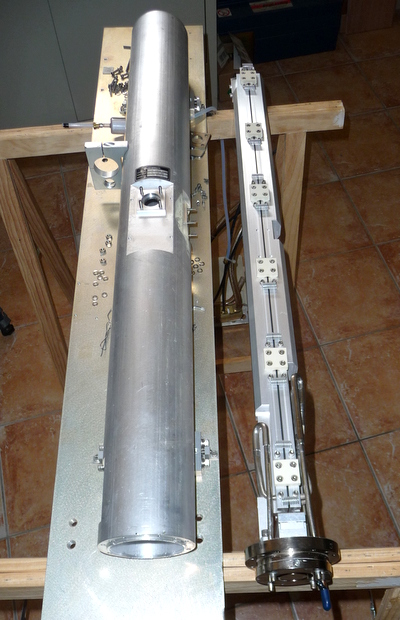 Pour cela il y a deux petits miroirs de renvoie à 45 degrés fixé sur le bras oscillant et la diode laser est montée sur un fixation réglable permettant de faire l'alignement des deux lasers sur le même point focal.