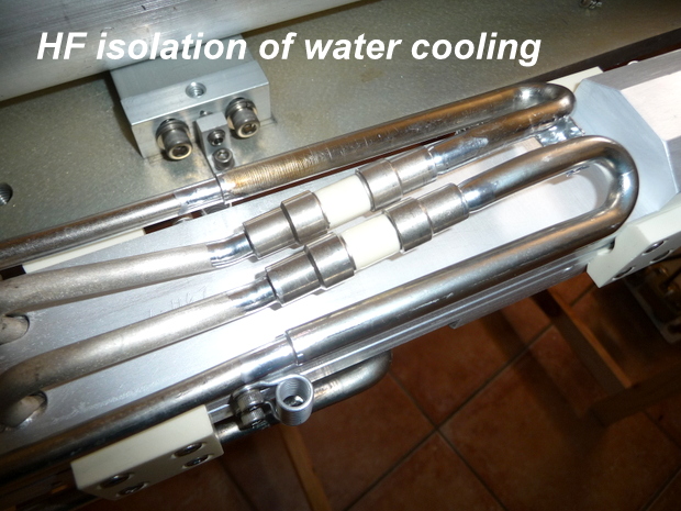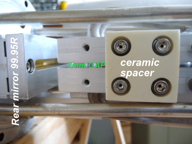 ici on vois bien les 2 électrodes de décharge en aluminium équipées des tubes de refroidissement avec les isolateurs céramique sur l'électrode active. Sur la photo on vois le miroir arrière de forme rectangulaire de 6mm x 50mm ainsi que les espaceurs en céramique permettant de tenir le gap de 2 mm entres les électrodes de décharge de 800mm de longueur.