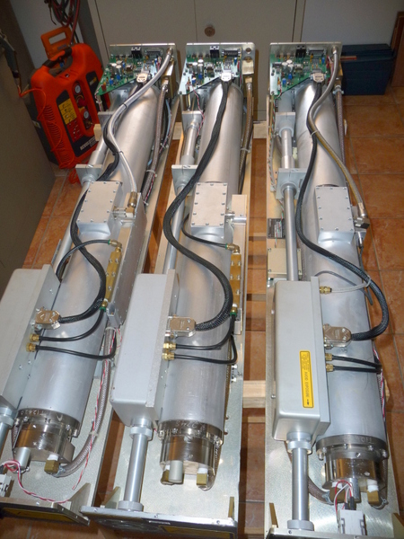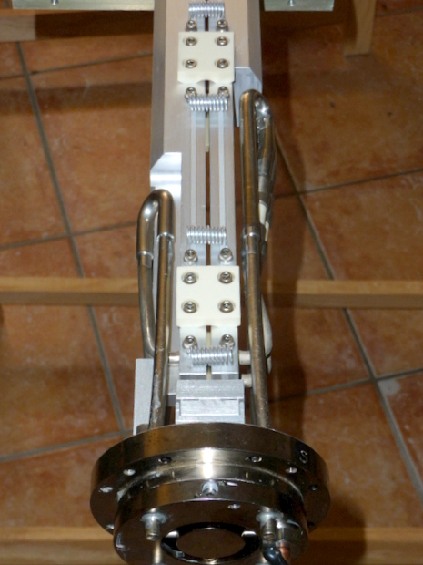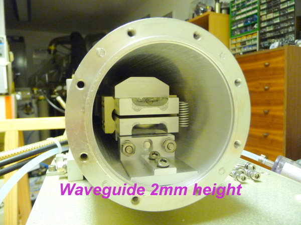 Démontage pour révision des électrodes de décharges. Pour cela il faut détacher les amenées de courant HR qui sont fixées sur les électrodes ( 4h de travail) puis sortir avec délicatesse les électrodes. La distance de 2mm entre électrodes est maintenue par 12 espaceurs en céramique. Une vingtaines de selfs sont distribuées le long des électrodes pour annulé la capacité formée par celles-ci. L'électrode du bas est reliée à la masse et l'électrode du haut est couplée sur le passage (feedthrough) de la HF venant du cable coaxial double blindage.