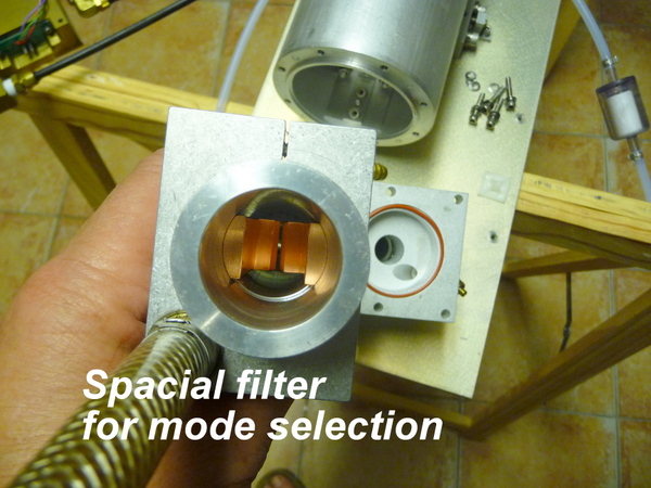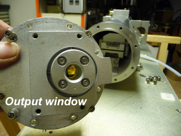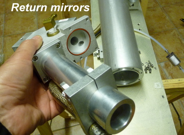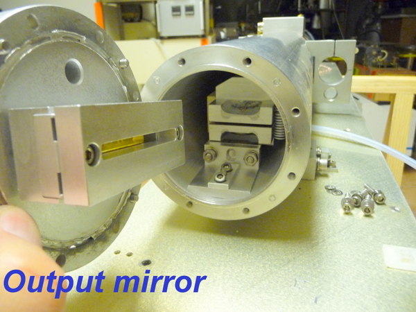 Un miroir se compose d'une portion de miroir sphérique avec un rayon de courbure de 820mm de rayon et de section rectangulaire de 50mm x 8mm. L'autre miroir se compose d'une portion de miroir sphérique avec un rayon de courbure de 780mm de rayon et de section rectangulaire de 40mm x 8mm avec une fenêtre de ZnSe permettant au faisceau de sortir de la cavité contenant le mélange He/N2/CO2/Xe pour être dirigé par 2 miroirs totalement réflecteur à 45 degrés sur le miroir de sortie concave formant le résonateur à branche négative au foyer du quel se trouve un filtre spacial travaillant uniquement dans un axe voilà pourquoi ce n'est pas un orifice calibré mais 2 lame de cuivre formant une fente pour créer le mode TEM00 (HE11)