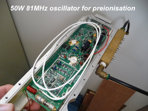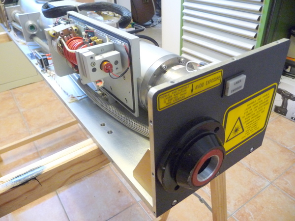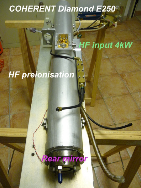 voici le tube laser en cours de démontage. On vois bien le boitier de couplage de l'entrée haute fréquence à 81.43 MHz et de 4kW pulsable de 1 Hz à 100kHz. Le boitier appeler "UV preionisation" est un petit génerateur HF qui permet de créer une préionisation au moyen d'un plasma UV permettant d'amorcer la décharge principal surtout au faible puissance d'émission. L'ancienne version de ce laser était muni d'une lampe UV à Hg-Ar émettant à 185nm et 245nm.