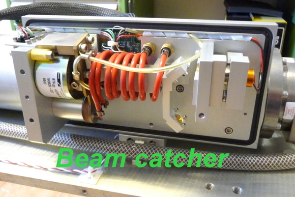Le "beam catcher" permet d'interrompre la sortie du faisceau sans interrompre la décharge plasma entre les électrodes de décharges. Il se compose d'un disque absorbant refroidit par circulation d'eau monté sur un bras oscillant actionné par un actuateur électromagnétique ultra rapide. Il est également équipé d'un laser à diode permettant de visualiser le point d'impact lorsque le faisceau laser est coupé.