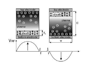 la fréquence d'excitation détermine l'épaisseur ds de la zone ionique +, cette épaisseur est inversement proportionnel à la fréquence et doit être inférieur à 10% de distance inter électrodes ds . f = 42mm.MHz