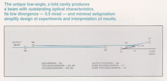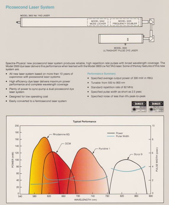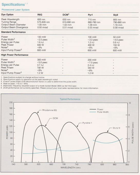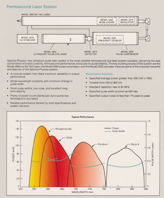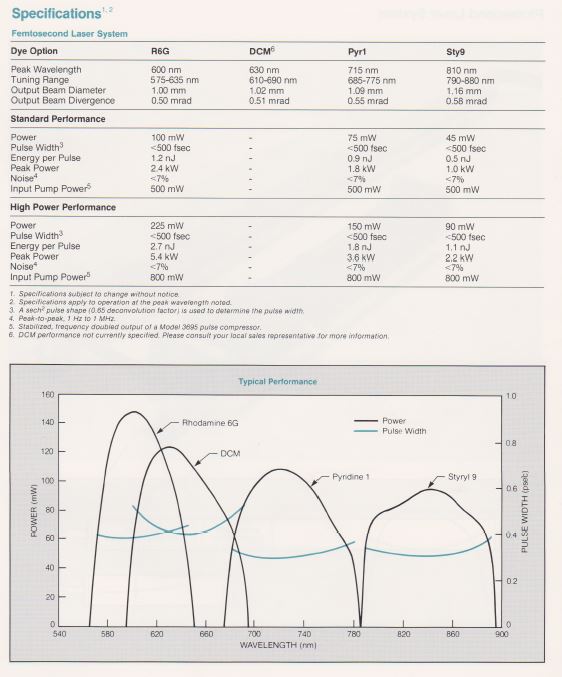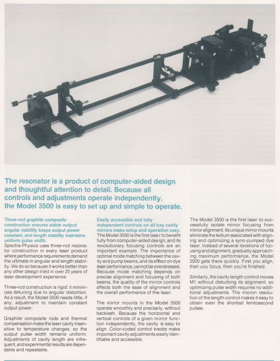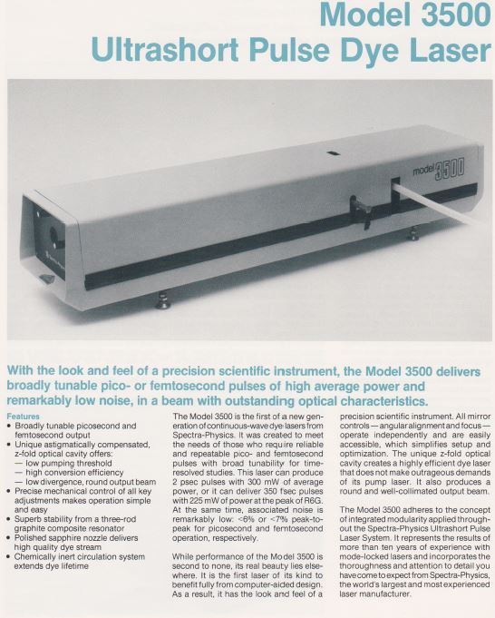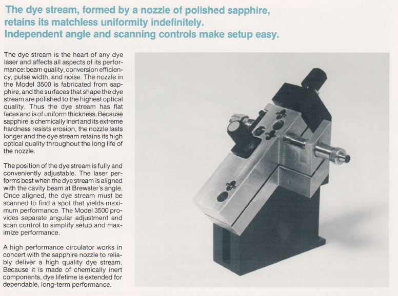 Le laser à colorant modèle 3500 consiste en une cavité optique en Z, une mécanique de précision pour les réglages, une buse en saphir poli et un filtre biréfringent optimisé couplé à une circulateur de colorant modèle 3760. Pompage synchrone Le système laser à colorant (sync-pompe) comprend un laser pompe à mode verrouillé et un laser à colorant dont la cavité est étendue de sorte que l'espacement inter-modes est un multiple entier de la fréquence de verrouillage du laser pompe. Dans cette configuration, chaque impulsion laser pompe entrant dans le jet de colorant le bord d'attaque amène la population des molécules de colorant excitées au-delà du seuil de laser. Parce que la cavité de la pompe et la cavité du colorant sont appariées, le laser à colorant