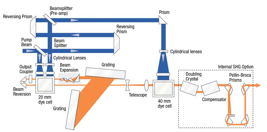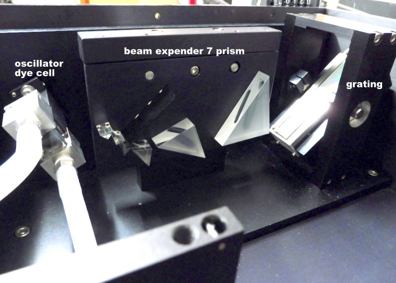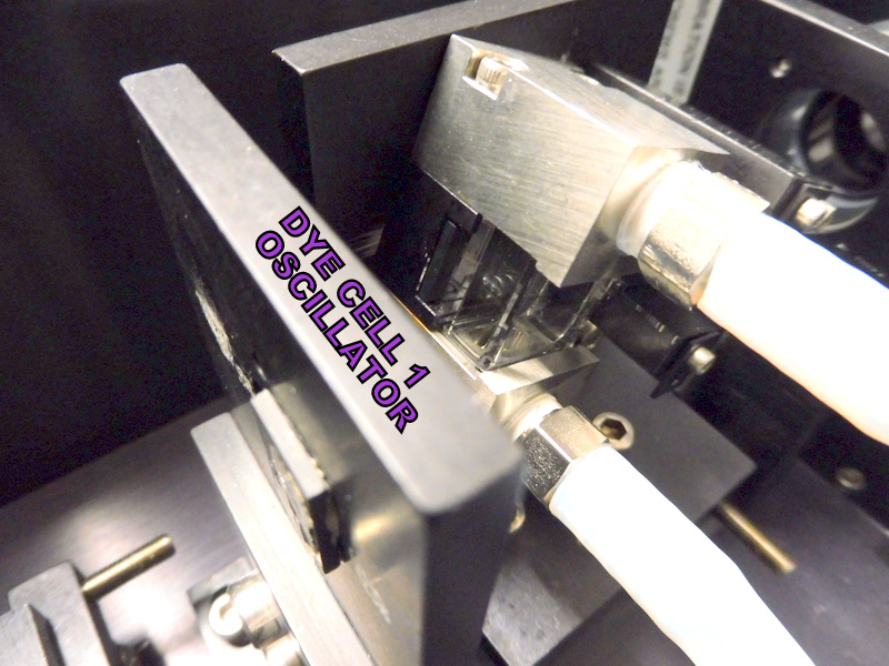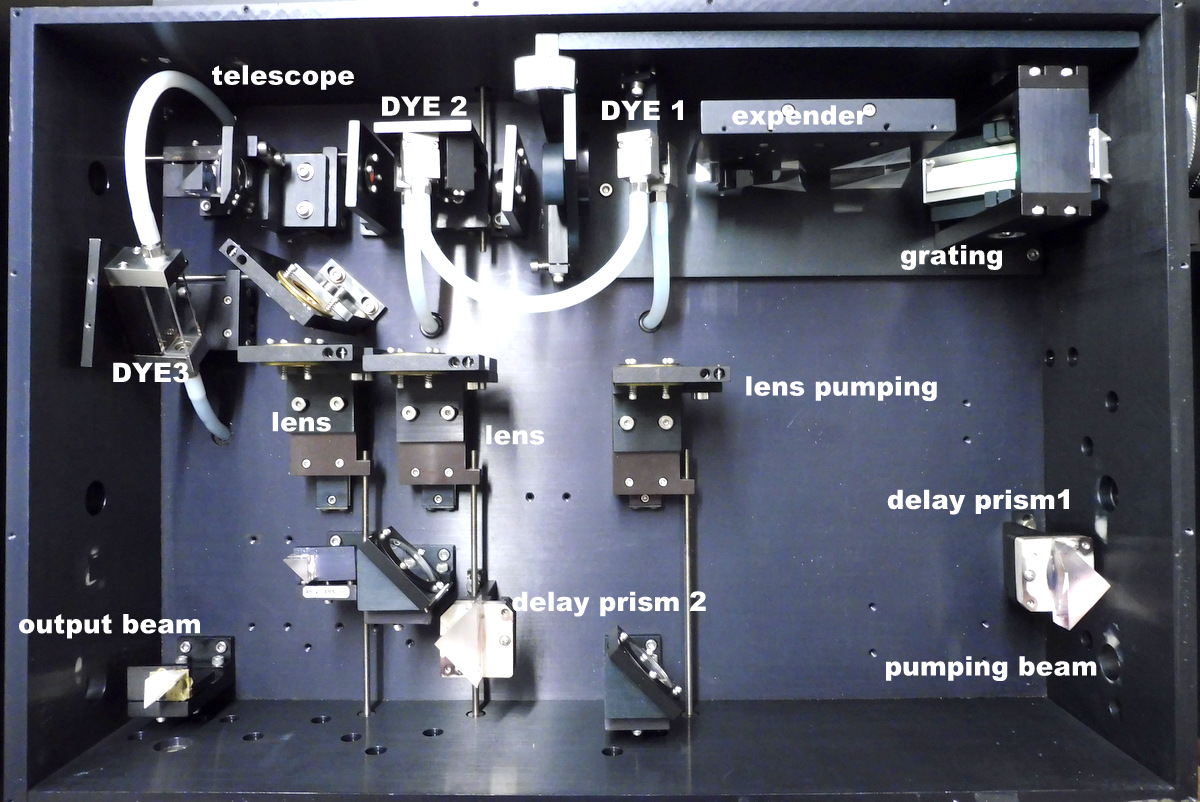 Le réglage de la fréquence est obtenue au moyen d'un étireur de faisceau et d'un réseau de diffraction réglable manuellement ou par un moteur pas à pas piloté par un ordinateur. Le faisceau est envoyé dans une cellule pré-amplificatrice puis à travers un télescope pour augmenté la section du faisceau pour éviter l'auto-focalisation puis est injecté dans une grande cellule amplificatrice. Chaque cellule est balayée par un flux rapide de colorant. La cellule amplificatrice est munie d'une circulation séparée de colorant avec une concentration plus faible pour éviter de partir en super-radiance. Le pompage des différentes cellules est optimisé par un délais optique des faisceaux pompe par la distance optique à parcourir pour atteindre chaque cellule. Ce délai est obtenu avec 3 prismes de renvoie.
