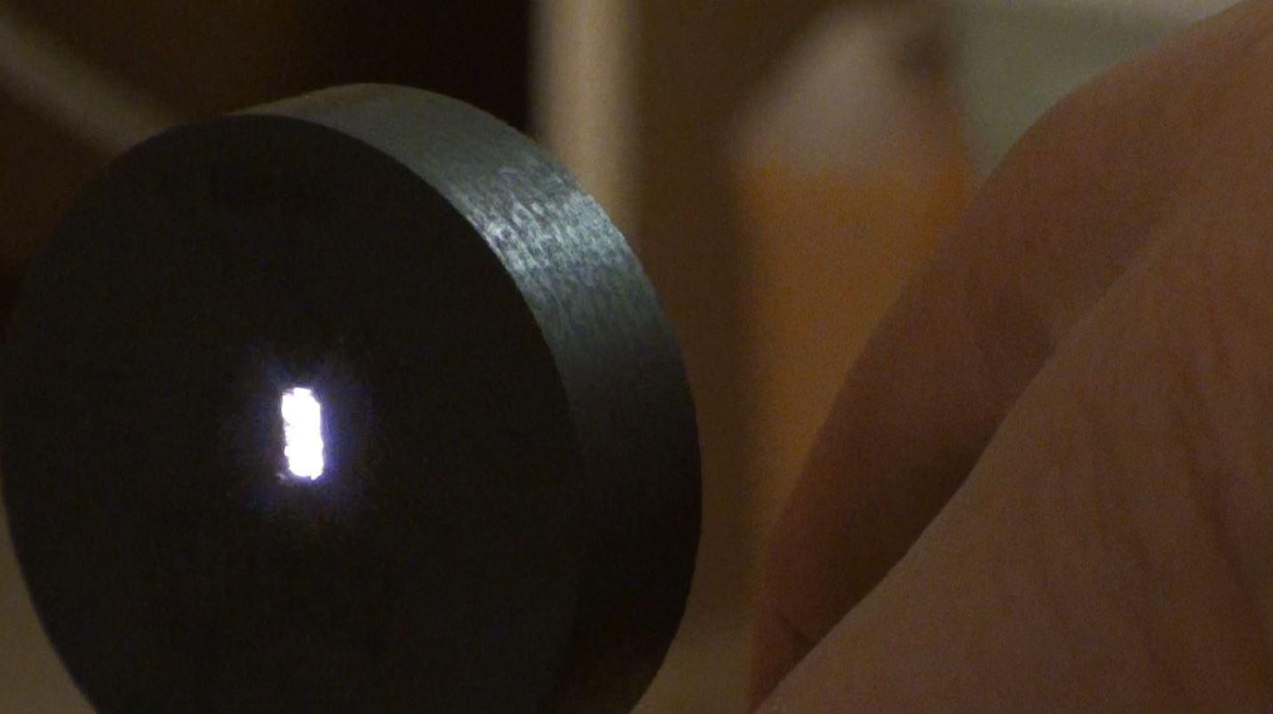 Durant l'impact soit environ 50ns la surface de carbone est chauffée à blanc ce qui permet de visualisé le faisceau. De cette manière on peux facilement régler les miroirs composant le résonnateur !