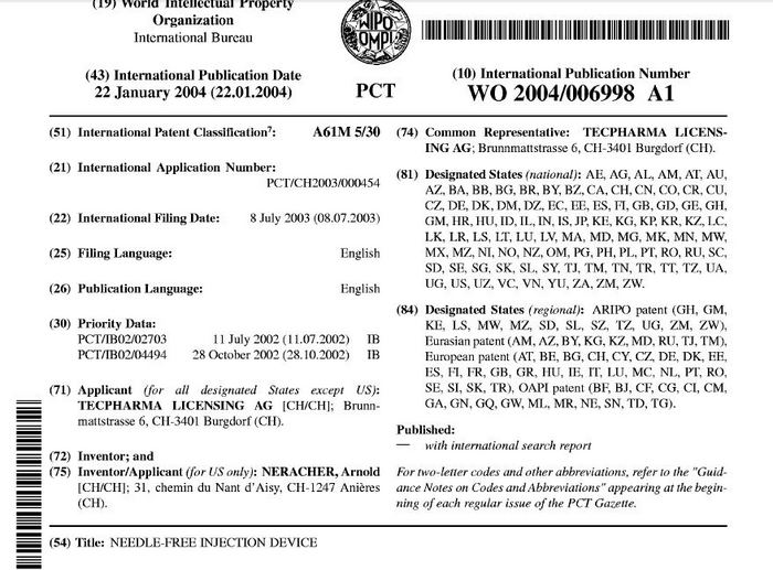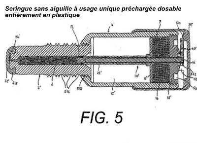 Cette seringue sans aiguille peut être fabriquée en version jetable à usage unique préchargée en pression pour l'injection de vaccins pour les pays en voie de développement.